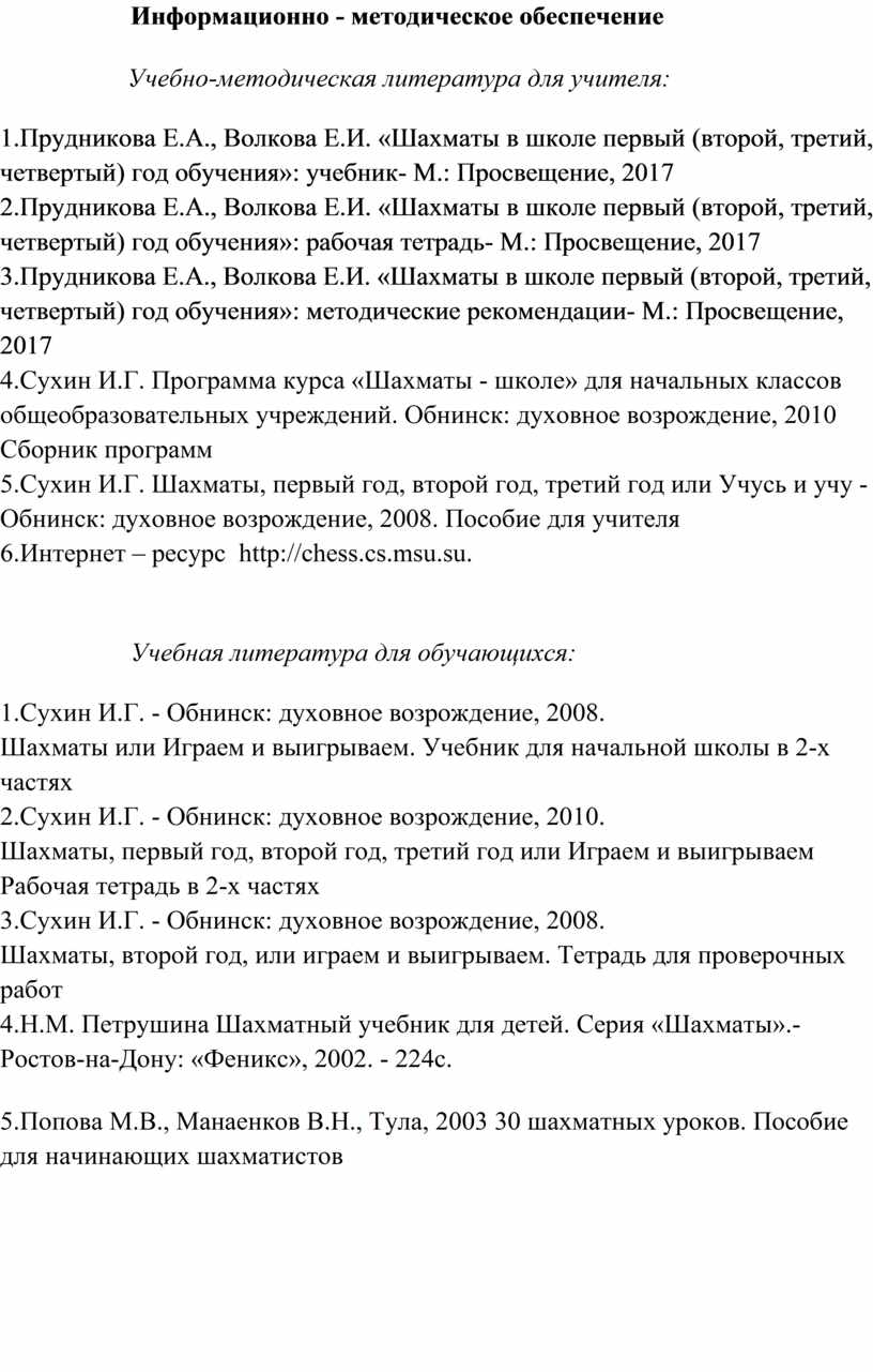 3.Прудникова Е.А., Волкова Е.И. «Шахматы в школе первый (второй, третий, четвертый) год обучения»: методические рекомендации- М.: Просвещение, 2017