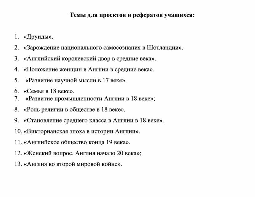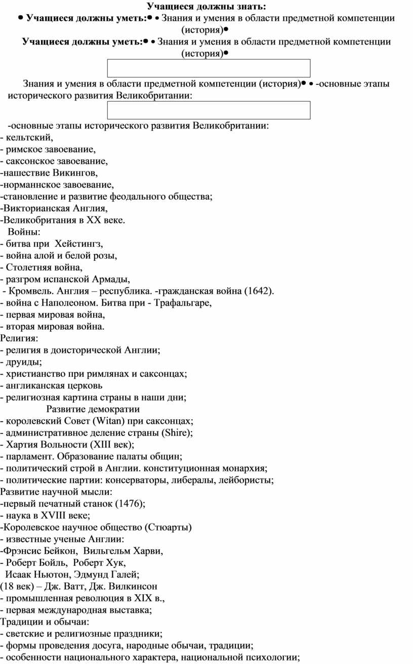 -основные этапы исторического развития Великобритании: - кельтский, - римское завоевание, - саксонское завоевание, -нашествие Викингов, -норманнское завоевание, -становление и развитие феодального общества; -Викторианская Англия, -Великобритания в ХХ веке. Войны: - битва при Хейстингз, - война алой и белой розы, - Столетняя война, - разгром испанской Армады, - Кромвель. Англия – республика. -гражданская война (1642). - война с Наполеоном. Битва при - Трафальгаре, - первая мировая война, - вторая мировая война. Религия: - религия в доисторической Англии; - друиды; - христианство при римлянах и саксонцах; - англиканская церковь - религиозная картина страны в наши дни; Развитие демократии - королевский Совет (Witan) при саксонцах; - административное деление страны (Shire); - Хартия Вольности (XIII век); - парламент. Образование палаты общин; - политический строй в Англии. конституционная монархия; - политические партии: консерваторы, либералы, лейбористы; Развитие научной мысли: -первый печатный станок (1476); - наука в XVIII веке; -Королевское научное общество (Стюарты) - известные ученые Англии: -Фрэнсис Бейкон, Вильгельм Харви, - Роберт Бойль, Роберт Хук, Исаак Ньютон, Эдмунд Галей; (18 век) – Дж. Ватт, Дж. Вилкинсон - промышленная революция в XIX в., - первая международная выставка; Традиции и обычаи: - светские и религиозные праздники; - формы проведения досуга, народные обычаи, традиции; - особенности национального характера, национальной психологии; - этические нормы поведения; - индивидуализм как стиль жизни; - особенности быта и повседневной жизни; - жилище в разные исторические этапы развития страны; - викторианский стиль; Язык и культура: - кельтский язык; - язык простых людей; - язык церкви; - язык юриспруденции; - первые школы и университеты; - Кентерберийские рассказы Дж. Чосера. - язык, литература и театр в Елизаветинской Англии; - В.Шекспир; - развитие живописи; - язык и литература викторианской Англии; - молодежное движение; - музыкальная жизнь страны; - развитие спорта, туризма; |