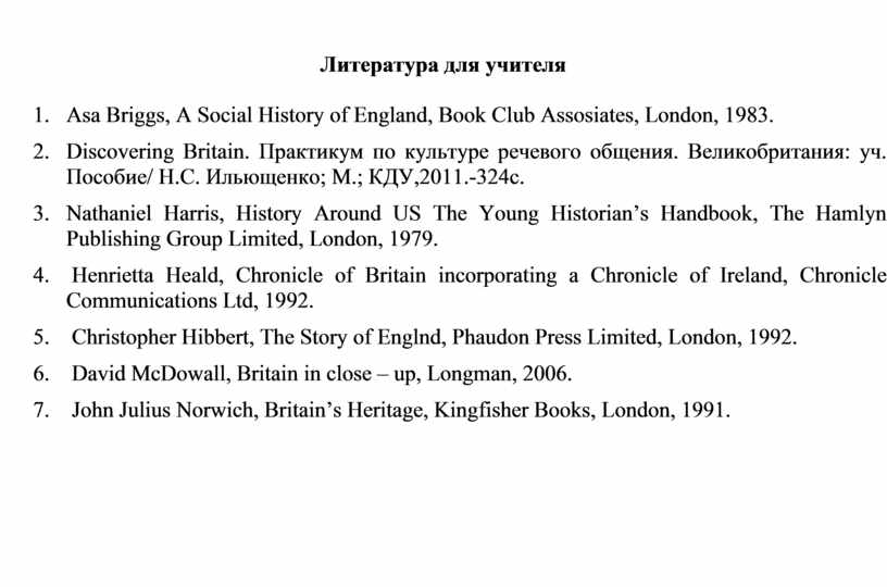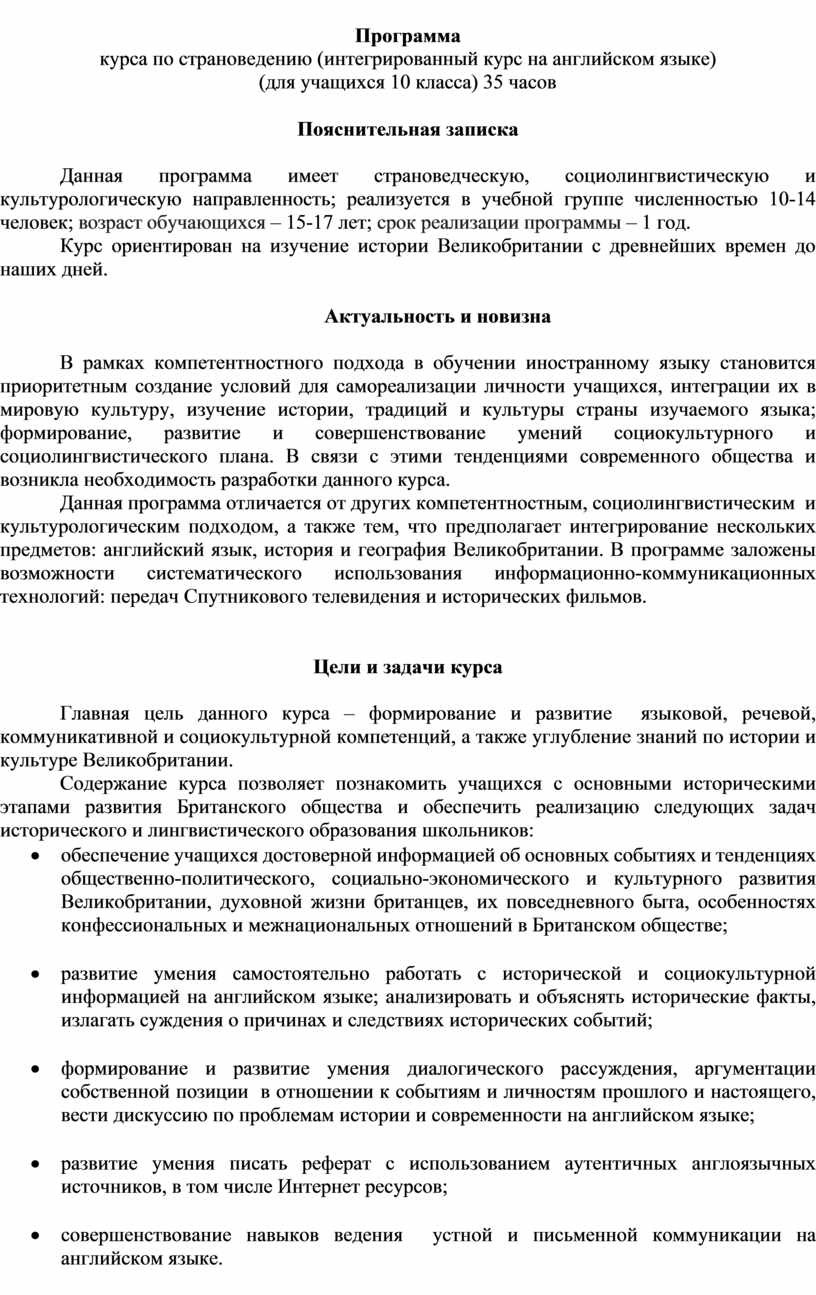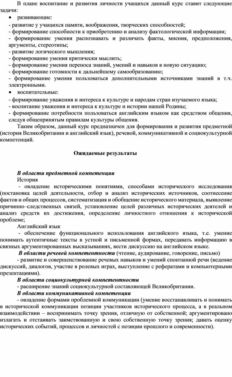 Таким образом, данный курс предназначен для формирования и развития предметной (история Великобритании и английский язык), речевой, коммуникативной и социокультурной компетенций.