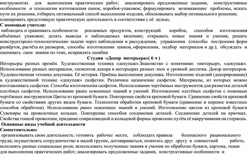 Интерьеры разных времён. Художественная техника «декупаж».Знакомство с понятиями: «интерьер», «декупаж». Использование разных материалов, элементов декора в интерьерах разных эпох и уровней достатка. Декор интерьеров. Художественная техника декупажа. Её история. Приёмы выполнения декупажа. Изготовление изделий (декорирование) в художественной технике «декупаж» салфетки. Различное назначение салфеток. Материалы, из которых можно изготавливать салфетки. Способы изготовления салфеток. Использование чертёжных инструментов для разметки деталей плетёных салфеток. Использование ранее освоенных знаний и умений. Изготовление плетёных салфеток с помощью чертёжных инструментов Цветы из креповой бумаги. Повторение свойств креповой бумаги. Сравнение свойств креповой бумаги со свойствами других видов бумаги. Технология обработки креповой бумаги (сравнение и перенос известных способов обработки). Использование ранее освоенных знаний и умений. Изготовление цветов из креповой бумаги Сувениры на проволочных кольцах. Повторение способов соединения деталей. Соединение деталей на крючках. Свойства тонкой проволоки, придание спиралевидной и кольцевой формы проволоке путём её накручивания на стержень.