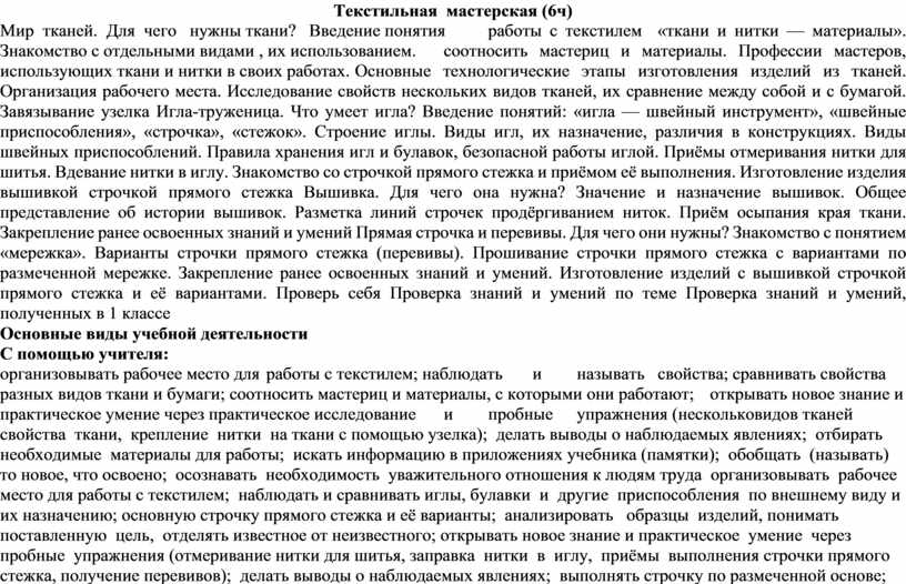 Мир тканей. Для чего нужны ткани? Введение понятия работы с текстилем «ткани и нитки — материалы». Знакомство с отдельными видами , их использованием. соотносить мастериц и материалы. Профессии мастеров, использующих ткани и нитки в своих работах. Основные технологические этапы изготовления изделий из тканей. Организация рабочего места. Исследование свойств нескольких видов тканей, их сравнение между собой и с бумагой. Завязывание узелка Игла-труженица. Что умеет игла? Введение понятий: «игла — швейный инструмент», «швейные приспособления», «строчка», «стежок». Строение иглы. Виды игл, их назначение, различия в конструкциях. Виды швейных приспособлений. Правила хранения игл и булавок, безопасной работы иглой. Приёмы отмеривания нитки для шитья. Вдевание нитки в иглу. Знакомство со строчкой прямого стежка и приёмом её выполнения. Изготовление изделия вышивкой строчкой прямого стежка Вышивка. Для чего она нужна? Значение и назначение вышивок. Общее представление об истории вышивок. Разметка линий строчек продёргиванием ниток. Приём осыпания края ткани. Закрепление ранее освоенных знаний и умений Прямая строчка и перевивы. Для чего они нужны? Знакомство с понятием «мережка». Варианты строчки прямого стежка (перевивы). Прошивание строчки прямого стежка с вариантами по размеченной мережке. Закрепление ранее освоенных знаний и умений. Изготовление изделий с вышивкой строчкой прямого стежка и её вариантами. Проверь себя Проверка знаний и умений по теме Проверка знаний и умений, полученных в 1 классе