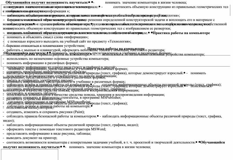 - понимать и объяснять значение компьютера в жизни человека, в собственной жизни; - понимать и объяснять смысл слова «информация»; - с помощью взрослого выходить на учебный сайт по предмету «Технология»; - бережно относиться к техническим устройствам; - работать с мышью и клавиатурой, оформлять небольшие тексты с помощью текстового редактора; - соблюдать режим и правила работы на компьютере. |