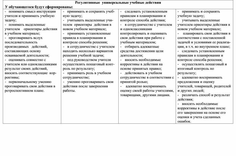 - понимать смысл инструкции учителя и принимать учебную задачу; - понимать выделенные учителем ориентиры действия в учебном материале; - проговаривать вслух последовательность производимых действий, составляющих основу осваиваемой деятельности; - оценивать совместно с учителем или одноклассниками результат своих действий, вносить соответствующие коррективы; - первоначальному умению проговаривать свои действия в ретроспективном плане. |