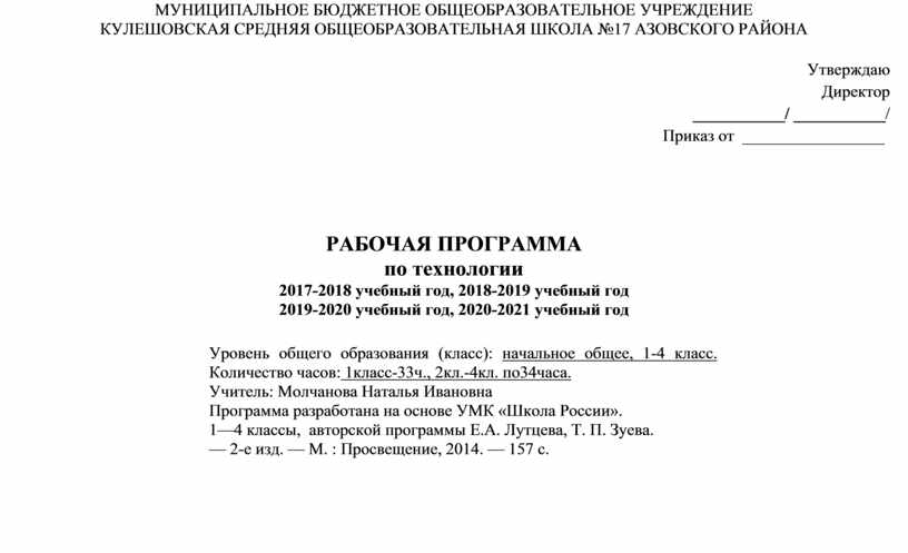 Уровень общего образования (класс): начальное общее, 1-4 класс. Количество часов: 1класс-33ч., 2кл.-4кл. по34часа. Учитель: Молчанова Наталья Ивановна Программа разработана на основе УМК «Школа России». 1—4 классы, авторской программы Е.А. Лутцева, Т. П. Зуева. — 2-е изд. — М. : Просвещение, 2014. — 157 с.