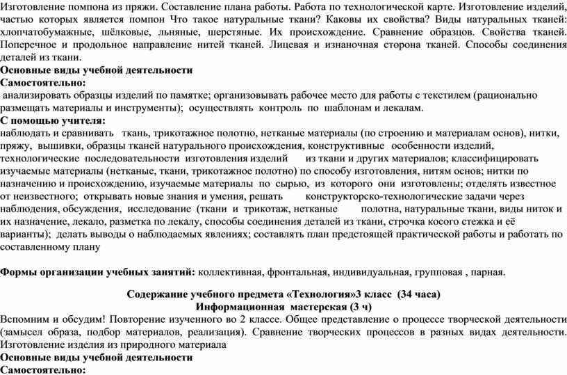 Какие бывают ткани? Ткачество и вязание. Ткани и трикотаж. Их строение, свойства. Нетканые материалы (флизелин, синтепон, ватные диски), их строение и свойства. Использование тканей, трикотажа, нетканых материалов. Профессии швеи и вязальщицы. Разметка на глаз и по шаблонам. Точечное клеевое соединение деталей, биговка. Составление плана работы. Работа по технологической карте. Изготовление изделий из нетканых материалов (ватных дисков, синтепона) Какие бывают нитки. Как они используются? Виды ниток: шёлковые, мулине, швейные, пряжа. Их использование. Происхождение шерстяных ниток — пряжи. Изготовление пряжи — прядение. Отображение древнего ремесла прядения в картинах художников. Изготовление колец для помпона с помощью циркуля. Чтение чертежа. Изготовление помпона из пряжи. Составление плана работы. Работа по технологической карте. Изготовление изделий, частью которых является помпон Что такое натуральные ткани? Каковы их свойства? Виды натуральных тканей: хлопчатобумажные, шёлковые, льняные, шерстяные. Их происхождение. Сравнение образцов. Свойства тканей. Поперечное и продольное направление нитей тканей. Лицевая и изнаночная сторона тканей. Способы соединения деталей из ткани.