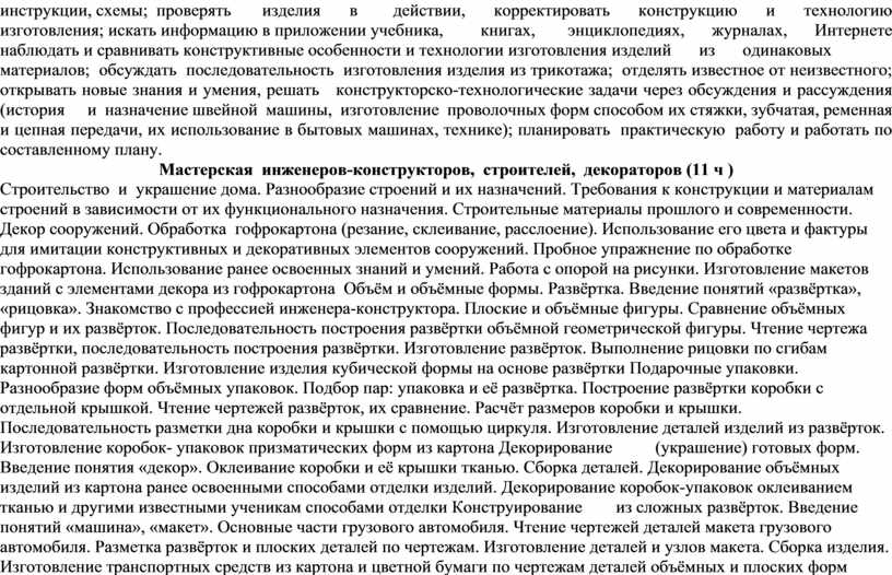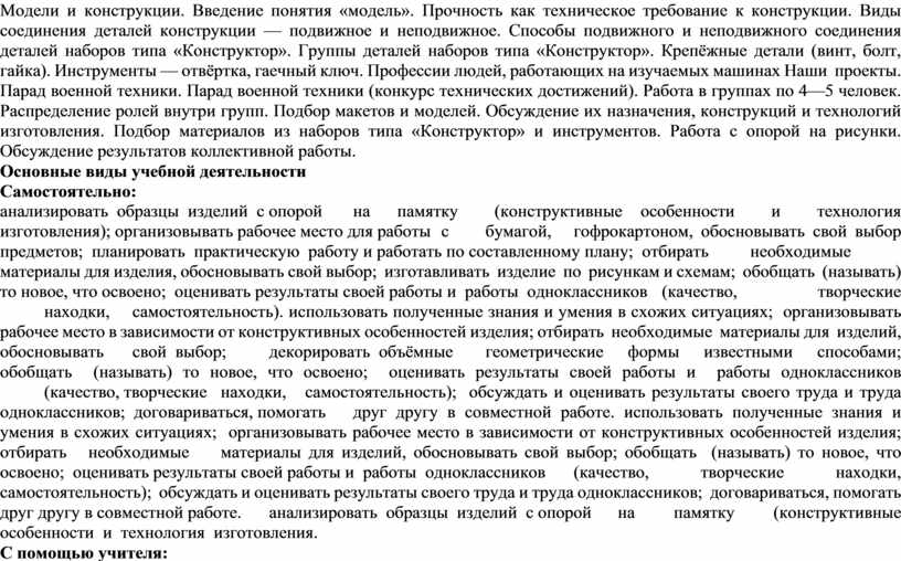 Строительство и украшение дома. Разнообразие строений и их назначений. Требования к конструкции и материалам строений в зависимости от их функционального назначения. Строительные материалы прошлого и современности. Декор сооружений. Обработка гофрокартона (резание, склеивание, расслоение). Использование его цвета и фактуры для имитации конструктивных и декоративных элементов сооружений. Пробное упражнение по обработке гофрокартона. Использование ранее освоенных знаний и умений. Работа с опорой на рисунки. Изготовление макетов зданий с элементами декора из гофрокартона Объём и объёмные формы. Развёртка. Введение понятий «развёртка», «рицовка». Знакомство с профессией инженера-конструктора. Плоские и объёмные фигуры. Сравнение объёмных фигур и их развёрток. Последовательность построения развёртки объёмной геометрической фигуры. Чтение чертежа развёртки, последовательность построения развёртки. Изготовление развёрток. Выполнение рицовки по сгибам картонной развёртки. Изготовление изделия кубической формы на основе развёртки Подарочные упаковки. Разнообразие форм объёмных упаковок. Подбор пар: упаковка и её развёртка. Построение развёртки коробки с отдельной крышкой. Чтение чертежей развёрток, их сравнение. Расчёт размеров коробки и крышки. Последовательность разметки дна коробки и крышки с помощью циркуля. Изготовление деталей изделий из развёрток. Изготовление коробок- упаковок призматических форм из картона Декорирование (украшение) готовых форм. Введение понятия «декор». Оклеивание коробки и её крышки тканью. Сборка деталей. Декорирование объёмных изделий из картона ранее освоенными способами отделки изделий. Декорирование коробок-упаковок оклеиванием тканью и другими известными ученикам способами отделки Конструирование из сложных развёрток. Введение понятий «машина», «макет». Основные части грузового автомобиля. Чтение чертежей деталей макета грузового автомобиля. Разметка развёрток и плоских деталей по чертежам. Изготовление деталей и узлов макета. Сборка изделия. Изготовление транспортных средств из картона и цветной бумаги по чертежам деталей объёмных и плоских форм Модели и конструкции. Введение понятия «модель». Прочность как техническое требование к конструкции. Виды соединения деталей конструкции — подвижное и неподвижное. Способы подвижного и неподвижного соединения деталей наборов типа «Конструктор». Группы деталей наборов типа «Конструктор». Крепёжные детали (винт, болт, гайка). Инструменты — отвёртка, гаечный ключ. Профессии людей, работающих на изучаемых машинах Наши проекты. Парад военной техники. Парад военной техники (конкурс технических достижений). Работа в группах по 4—5 человек. Распределение ролей внутри групп. Подбор макетов и моделей. Обсуждение их назначения, конструкций и технологий изготовления. Подбор материалов из наборов типа «Конструктор» и инструментов. Работа с опорой на рисунки. Обсуждение результатов коллективной работы.
