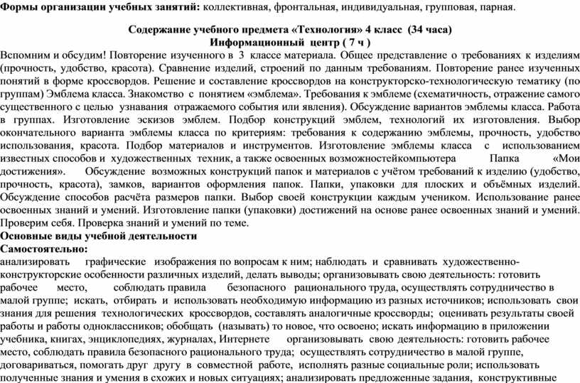 Вспомним и обсудим! Повторение изученного в 3 классе материала. Общее представление о требованиях к изделиям (прочность, удобство, красота). Сравнение изделий, строений по данным требованиям. Повторение ранее изученных понятий в форме кроссвордов. Решение и составление кроссвордов на конструкторско-технологическую тематику (по группам) Эмблема класса. Знакомство с понятием «эмблема». Требования к эмблеме (схематичность, отражение самого существенного с целью узнавания отражаемого события или явления). Обсуждение вариантов эмблемы класса. Работа в группах. Изготовление эскизов эмблем. Подбор конструкций эмблем, технологий их изготовления. Выбор окончательного варианта эмблемы класса по критериям: требования к содержанию эмблемы, прочность, удобство использования, красота. Подбор материалов и инструментов. Изготовление эмблемы класса с использованием известных способов и художественных техник, а также освоенных возможностей компьютера Папка «Мои достижения». Обсуждение возможных конструкций папок и материалов с учётом требований к изделию (удобство, прочность, красота), замков, вариантов оформления папок. Папки, упаковки для плоских и объёмных изделий. Обсуждение способов расчёта размеров папки. Выбор своей конструкции каждым учеником. Использование ранее освоенных знаний и умений. Изготовление папки (упаковки) достижений на основе ранее освоенных знаний и умений. Проверим себя. Проверка знаний и умений по теме.