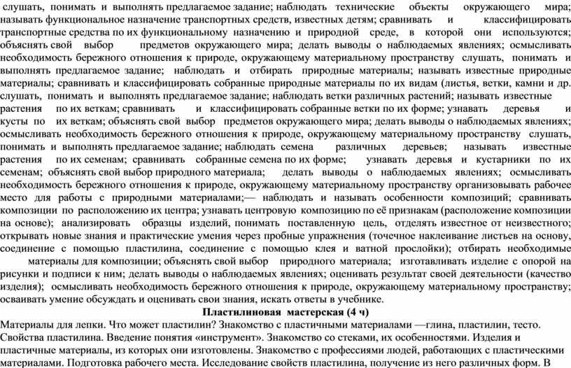 слушать, понимать и выполнять предлагаемое задание; наблюдать технические объекты окружающего мира; называть функциональное назначение транспортных средств, известных детям; сравнивать и классифицировать транспортные средства по их функциональному назначению и природной среде, в которой они используются; объяснять свой выбор предметов окружающего мира; делать выводы о наблюдаемых явлениях; осмысливать необходимость бережного отношения к природе, окружающему материальному пространству слушать, понимать и выполнять предлагаемое задание; наблюдать и отбирать природные материалы; называть известные природные материалы; сравнивать и классифицировать собранные природные материалы по их видам (листья, ветки, камни и др. слушать, понимать и выполнять предлагаемое задание; наблюдать ветки различных растений; называть известные растения по их веткам; сравнивать и классифицировать собранные ветки по их форме; узнавать деревья и кусты по их веткам; объяснять свой выбор предметов окружающего мира; делать выводы о наблюдаемых явлениях; осмысливать необходимость бережного отношения к природе, окружающему материальному пространству слушать, понимать и выполнять предлагаемое задание; наблюдать семена различных деревьев; называть известные растения по их семенам; сравнивать собранные семена по их форме; узнавать деревья и кустарники по их семенам; объяснять свой выбор природного материала; делать выводы о наблюдаемых явлениях; осмысливать необходимость бережного отношения к природе, окружающему материальному пространству организовывать рабочее место для работы с природными материалами;— наблюдать и называть особенности композиций; сравнивать композиции по расположению их центра; узнавать центровую композицию по её признакам (расположение композиции на основе); анализировать образцы изделий, понимать поставленную цель, отделять известное от неизвестного; открывать новые знания и практические умения через пробные упражнения (точечное наклеивание листьев на основу, соединение с помощью пластилина, соединение с помощью клея и ватной прослойки); отбирать необходимые материалы для композиции; объяснять свой выбор природного материала; изготавливать изделие с опорой на рисунки и подписи к ним; делать выводы о наблюдаемых явлениях; оценивать результат своей деятельности (качество изделия); осмысливать необходимость бережного отношения к природе, окружающему материальному пространству; осваивать умение обсуждать и оценивать свои знания, искать ответы в учебнике.
