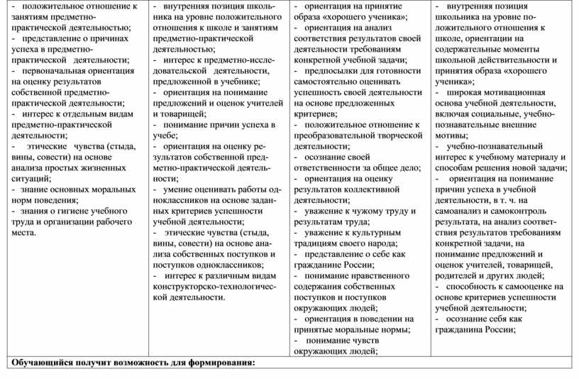 - внутренней позиции обучающегося на уровне положительного отношения к образовательному учреждению, понимания необходимости учения; - широких социальных и учебно-познавательных мотивов учения; - учебно-познавательного интереса к нахождению разных способов решения учебной задачи; - способности к самооценке на основе критериев успешности учебной деятельности; - сопереживания другим людям; - следования в поведении моральным нормам и этическим требованиям; - осознания себя как гражданина России; - чувства прекрасного и эстетических чувств на основе знакомства с материалами курса по технологии; - готовности следовать в своей деятельности нормам природоохранного, здоровьесберегающего поведения. |