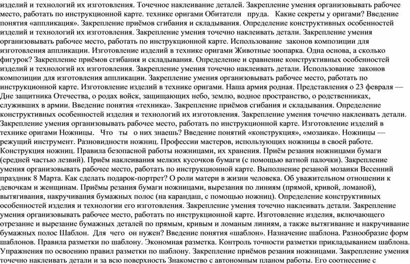 Мастерская Деда Мороза и Снегурочки. Оборудование рабочего места. Подбор и соотнесение материалов и ёлочных игрушек. Знакомство с ножницами, правилами техники безопасности. Формообразование бумажных игрушек из бумажных полосок Наши проекты. Скоро Новый год! Работа в группах по 4—6 человек. Обсуждение конструкций ёлочных подвесок, технологий их изготовления. Распределение работы внутри групп учителем. Работа с опорой на рисунки. Обсуждение результатов коллективной работы. Украшение класса, рекреаций школы. Изготовление ёлочных игрушек из бумажных полосок Бумага. Какие у неё есть секреты? Введение понятия «бумага — материал». Знакомство с видами бумаги, их использованием. Профессии мастеров, использующих бумагу в своих работах. Исследование свойств нескольких видов бумаги, их сравнение Бумага и картон. Какие секреты у картона? Введение понятия «картон — материал». Знакомство с разновидностями картона, их использованием в промышленности и творчестве мастеров. Исследование свойств картона в сравнении со свойствами бумаги Оригами. Как сгибать и складывать бумагу? Введение понятия «оригами». Освоение приёмов сгибания и складывания. Определение конструктивных особенностей изделий и технологий их изготовления. Точечное наклеивание деталей. Закрепление умения организовывать рабочее место, работать по инструкционной карте. технике оригами Обитатели пруда. Какие секреты у оригами? Введение понятия «аппликация». Закрепление приёмов сгибания и складывания. Определение конструктивных особенностей изделий и технологий их изготовления. Закрепление умения точечно наклеивать детали. Закрепление умения организовывать рабочее место, работать по инструкционной карте. Использование законов композиции для изготовления аппликации. Изготовление изделий в технике оригами Животные зоопарка. Одна основа, а сколько фигурок? Закрепление приёмов сгибания и складывания. Определение и сравнение конструктивных особенностей изделий и технологий их изготовления. Закрепление умения точечно наклеивать детали. Использование законов композиции для изготовления аппликации. Закрепление умения организовывать рабочее место, работать по инструкционной карте. Изготовление изделий в технике оригами. Наша армия родная. Представления о 23 февраля — Дне защитника Отечества, о родах войск, защищающих небо, землю, водное пространство, о родственниках, служивших в армии. Введение понятия «техника». Закрепление приёмов сгибания и складывания. Определение конструктивных особенностей изделия и технологий их изготовления. Закрепление умения точечно наклеивать детали. Закрепление умения организовывать рабочее место, работать по инструкционной карте. Изготовление изделий в технике оригами Ножницы. Что ты о них знаешь? Введение понятий «конструкция», «мозаика». Ножницы — режущий инструмент. Разновидности ножниц. Профессии мастеров, использующих ножницы в своей работе. Конструкция ножниц. Правила безопасной работы ножницами, их хранения. Приём резания ножницами бумаги (средней частью лезвий). Приём наклеивания мелких кусочков бумаги (с помощью ватной палочки). Закрепление умения организовывать рабочее место, работать по инструкционной карте. Выполнение резаной мозаики Весенний праздник 8 Марта. Как сделать подарок-портрет? О роли матери в жи