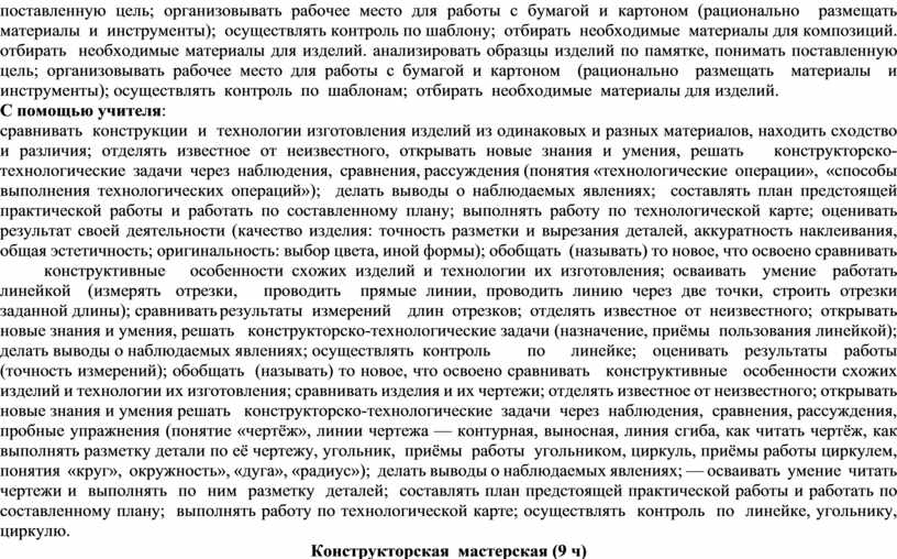 сравнивать конструкции и технологии изготовления изделий из одинаковых и разных материалов, находить сходство и различия; отделять известное от неизвестного, открывать новые знания и умения, решать конструкторско-технологические задачи через наблюдения, сравнения, рассуждения (понятия «технологические операции», «способы выполнения технологических операций»); делать выводы о наблюдаемых явлениях; составлять план предстоящей практической работы и работать по составленному плану; выполнять работу по технологической карте; оценивать результат своей деятельности (качество изделия: точность разметки и вырезания деталей, аккуратность наклеивания, общая эстетичность; оригинальность: выбор цвета, иной формы); обобщать (называть) то новое, что освоено сравнивать конструктивные особенности схожих изделий и технологии их изготовления; осваивать умение работать линейкой (измерять отрезки, проводить прямые линии, проводить линию через две точки, строить отрезки заданной длины); сравнивать результаты измерений длин отрезков; отделять известное от неизвестного; открывать новые знания и умения, решать конструкторско-технологические задачи (назначение, приёмы пользования линейкой); делать выводы о наблюдаемых явлениях; осуществлять контроль по линейке; оценивать результаты работы (точность измерений); обобщать (называть) то новое, что освоено сравнивать конструктивные особенности схожих изделий и технологии их изготовления; сравнивать изделия и их чертежи; отделять известное от неизвестного; открывать новые знания и умения решать конструкторско-технологические задачи через наблюдения, сравнения, рассуждения, пробные упражнения (понятие «чертёж», линии чертежа — контурная, выносная, линия сгиба, как читать чертёж, как выполнять разметку детали по её чертежу, угольник, приёмы работы угольником, циркуль, приёмы работы циркулем, понятия «круг», окружность», «дуга», «радиус»); делать выводы о наблюдаемых явлениях; — осваивать умение читать чертежи и выполнять по ним разметку деталей; составлять план предстоящей практической работы и работать по составленному плану; выполнять работу по технологической карте; осуществлять контроль по линейке, угольнику, циркулю.
