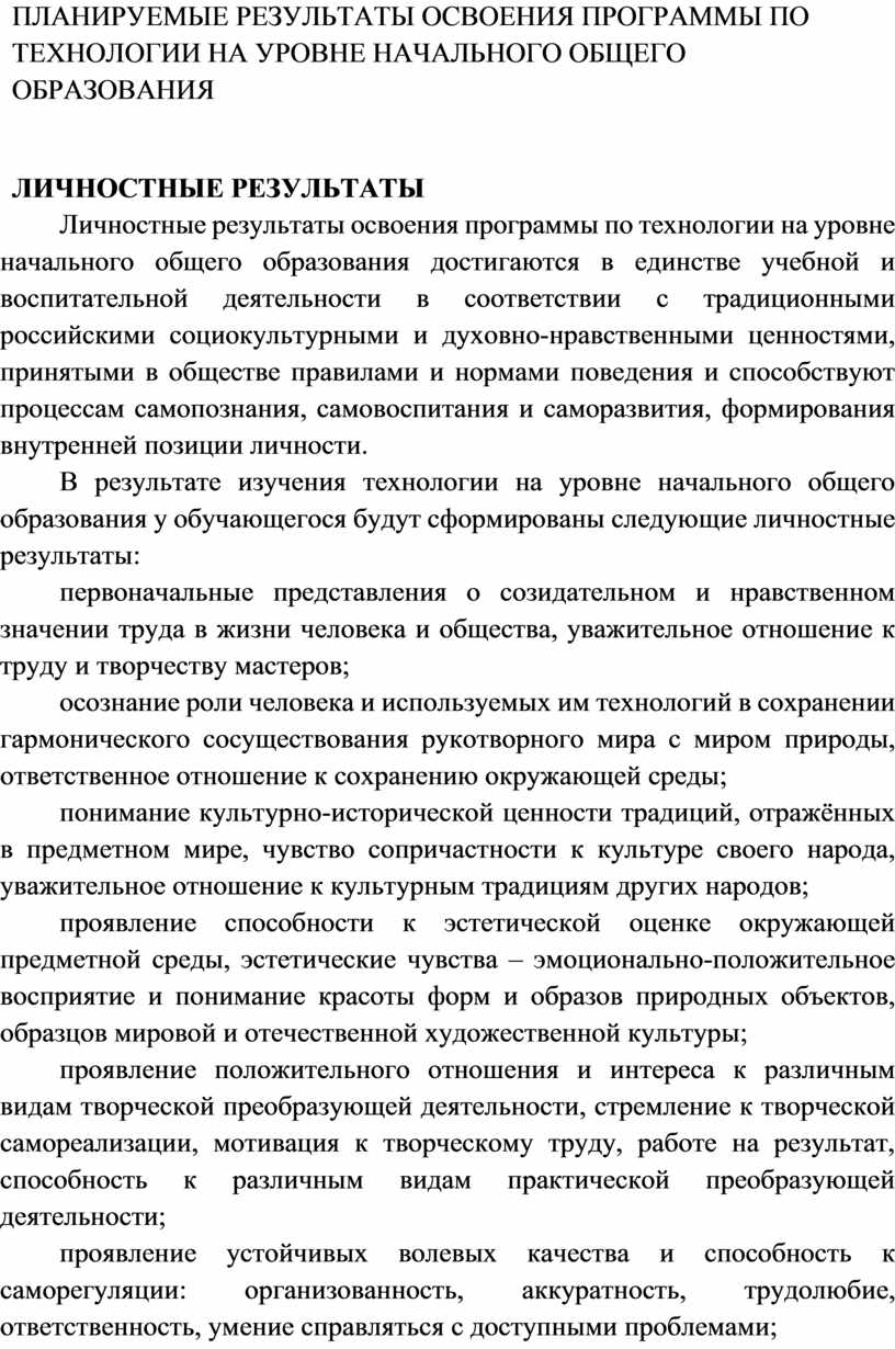Программа по технологии на уровне начального общего образования составлена на основе требований к результатам освоения основной образовательной программы начального общего образования ФГОС НОО, а также ориентирована на целевые приоритеты духовно-нравственного развития, воспитания и социализации обучающихся, сформулированные в федеральной рабочей программе воспитания.