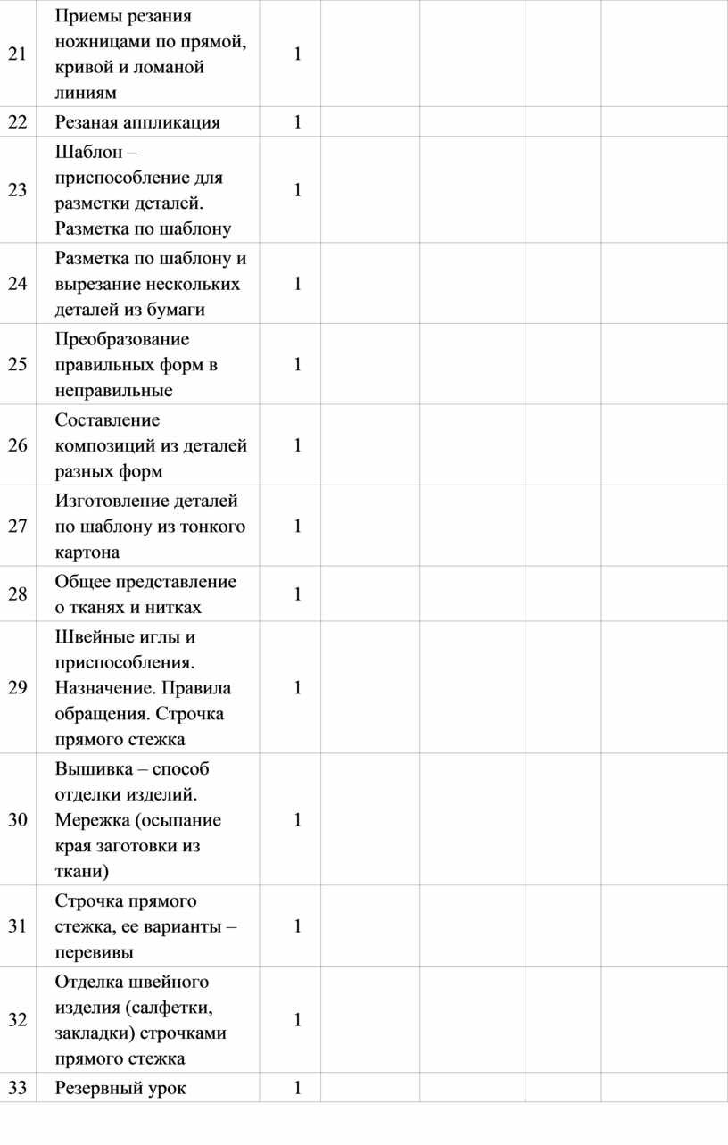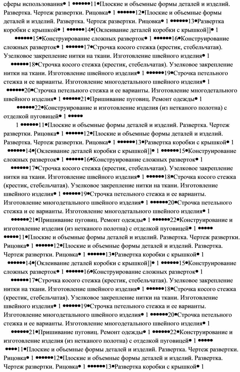 Технология обработки текстильных материалов. Строение ткани (поперечное и продольное направление нитей). Ткани и нитки растительного происхождения (полученные на основе натурального сырья). Виды ниток (швейные, мулине). Трикотаж, нетканые материалы (общее представление), его строение и основные свойства. Строчка прямого стежка и её варианты (перевивы, наборы) и (или) строчка косого стежка и её варианты (крестик, стебельчатая, ёлочка). Лекало. Разметка с помощью лекала (простейшей выкройки). Технологическая последовательность изготовления несложного швейного изделия (разметка деталей, выкраивание деталей, отделка деталей, сшивание деталей).
