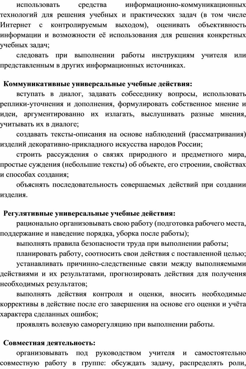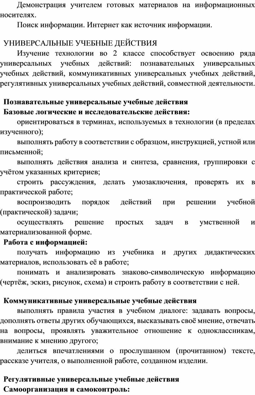 Изучение технологии во 2 классе способствует освоению ряда универсальных учебных действий: познавательных универсальных учебных действий, коммуникативных универсальных учебных действий, регулятивных универсальных учебных действий, совместной деятельности.