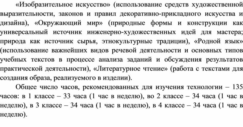 Общее число часов, рекомендованных для изучения технологии – 135 часов: в 1 классе – 33 часа (1 час в неделю), во 2 классе – 34 часа (1 час в неделю), в 3 классе – 34 часа (1 час в неделю), в 4 классе – 34 часа (1 час в неделю).
