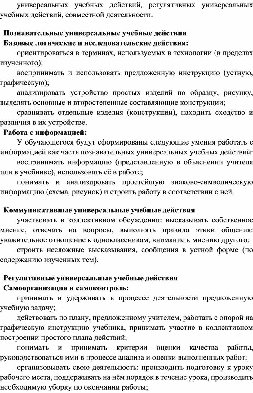Изучение технологии в 1 классе способствует освоению на пропедевтическом уровне ряда универсальных учебных действий: познавательных универсальных учебных действий, коммуникативных универсальных учебных действий, регулятивных универсальных учебных действий, совместной деятельности.