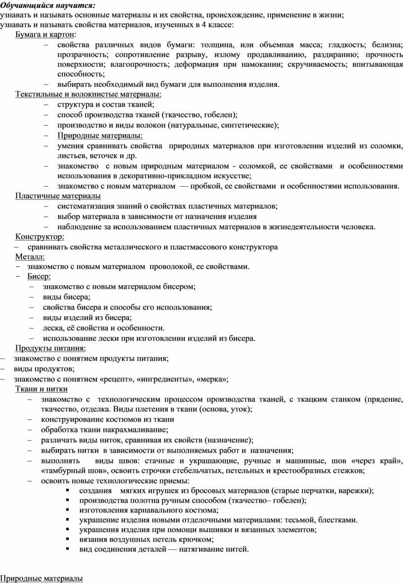 узнавать и называть свойства материалов, изученных в 4 классе: