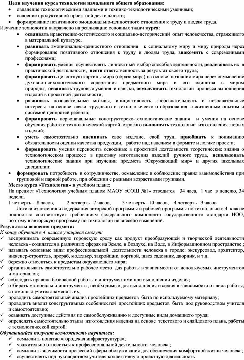 Логика изложения и содержания авторской программы и рабочей программы по технологии в 4 классе полностью соответствует требованиям федерального компонента государственного стандарта НОО, поэтому в авторскую программу по технологии не внесено изменений.