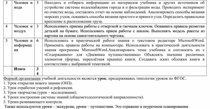 Находить и отбирать информацию из материалов учебника и других источников об устройстве системы водоснабжения города и о фильтрации воды. Проводить эксперимент по очистке воды, составлять отчет на основе наблюдений. Анализировать способы вязания морских узлов, осваивать способы вязания простого и прямого узла. Определять правильное крепление и расположение груза. |