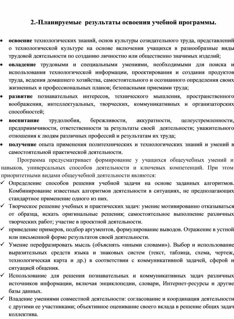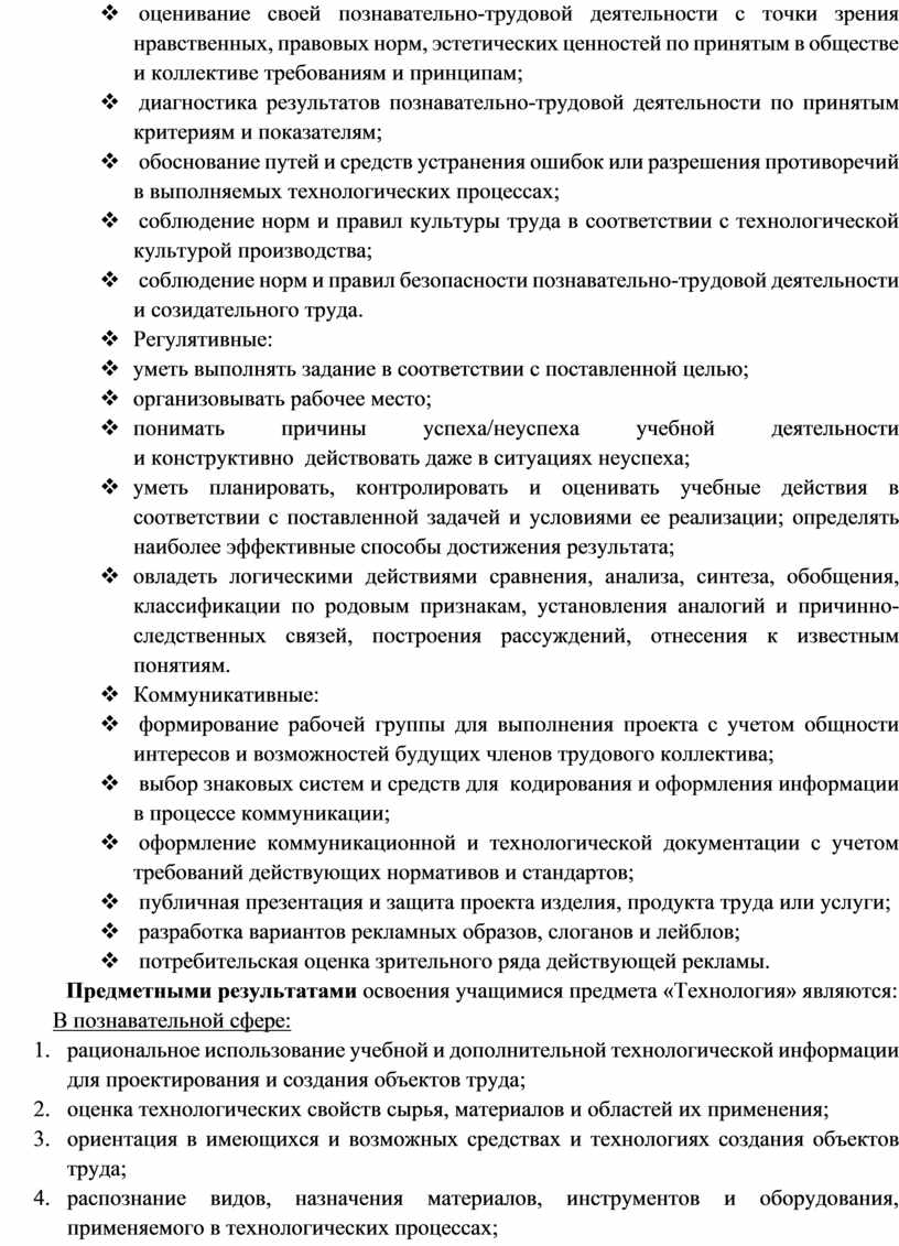 · освоение технологических знаний, основ культуры созидательного труда, представлений о технологической культуре на основе включения учащихся в разнообразные виды трудовой деятельности по созданию личностно или общественно значимых изделий;