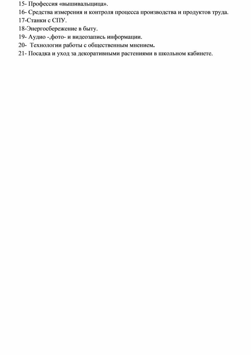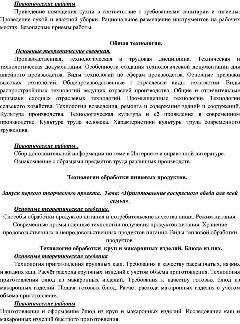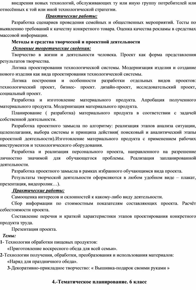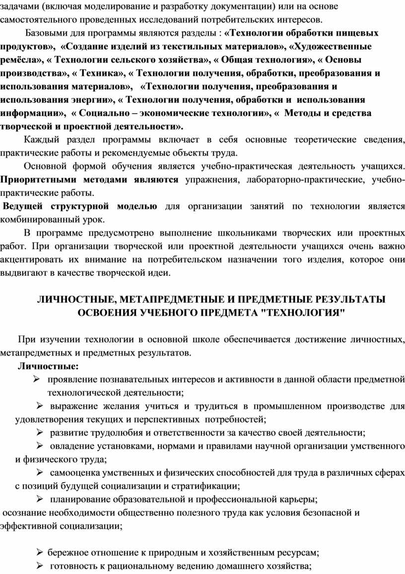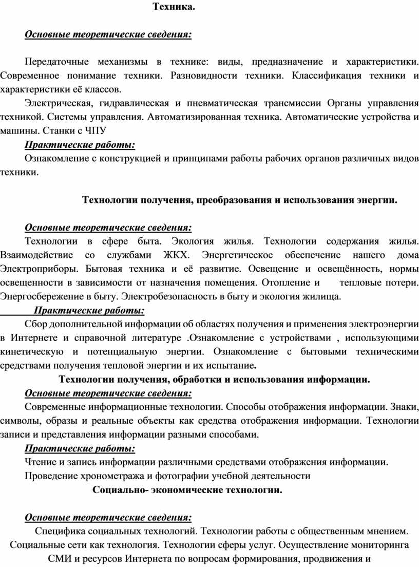 Базовыми для программы являются разделы : «Технологии обработки пищевых продуктов», «Создание изделий из текстильных материалов», «Художественные ремёсла», « Технологии сельского хозяйства», « Общая технология», « Основы производства», « Техника», « Технологии получения, обработки, преобразования и использования материалов», «Технологии получения, преобразования и использования энергии», « Технологии получения, обработки и использования информации», « Социально – экономические технологии», « Методы и средства творческой и проектной деятельности».