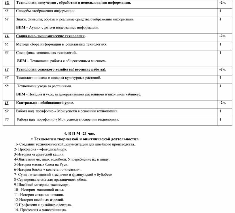 Инвариантная часть-49 часов: - Вводное занятие - 2часа. - Общая технология - 2 часа. -Технологии сельского хозяйства (осенние работы) - 2 часа. - Методы и средства творческой и проектной деятельности – 4 часа. - Технология обработки пищевых продуктов - 6 часов. -Технология получения обработки, преобразования и использования материалов -18 часов. -Основы производства - 2 часа. - Технологии животноводства-2 часа. -Технология получения, преобразования и использования энергии - 2 часа. -Технология получения, обработки и использования информации - 2 часа. -Социальные технологии.- 2 часа. -Технологии сельского хозяйства (весенние работы)- 2 часа. -Контрольно-обобщающее занятие- 1 час.