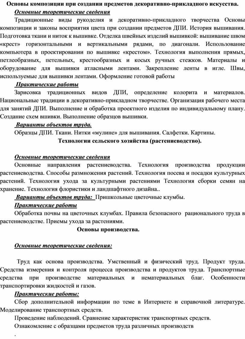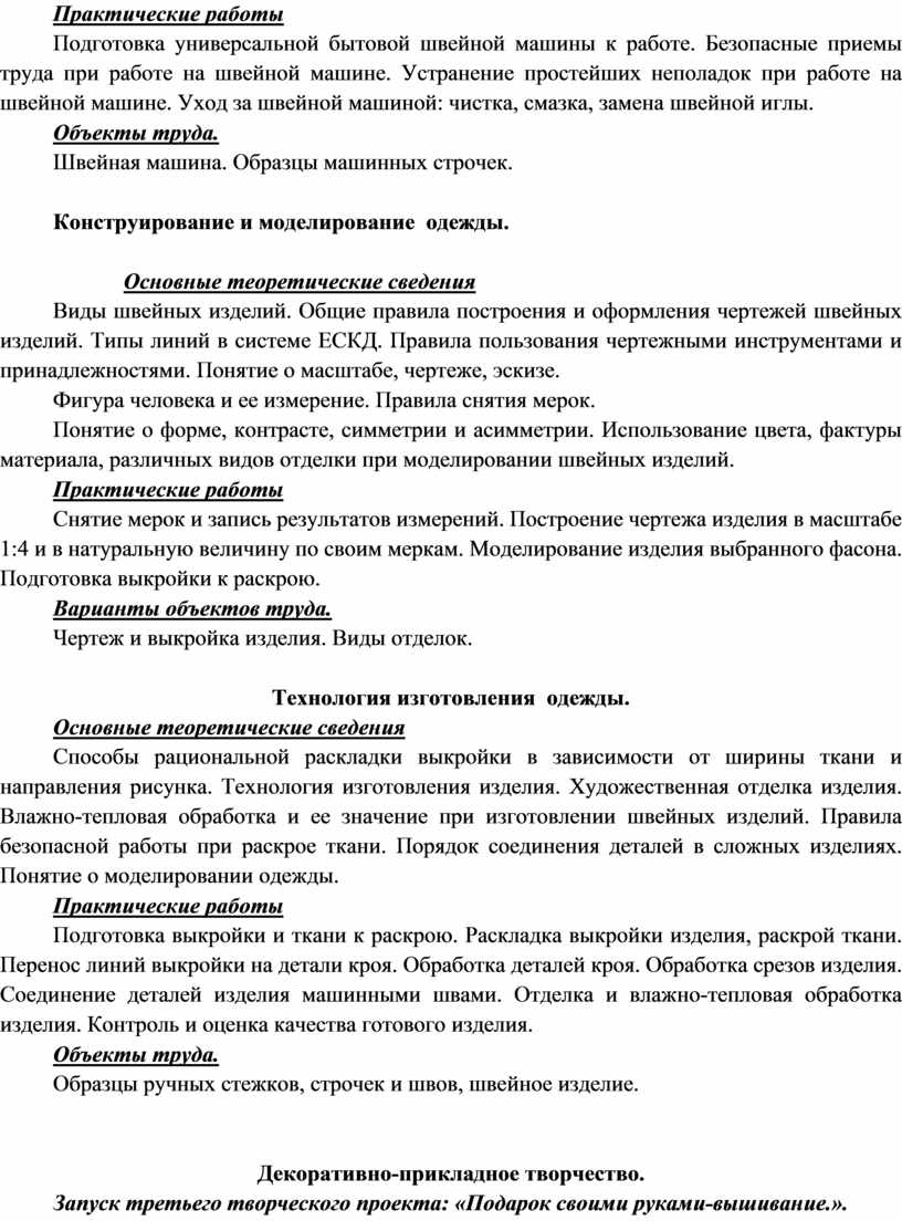 Каждый раздел программы включает в себя основные теоретические сведения, практические работы и рекомендуемые объекты труда.