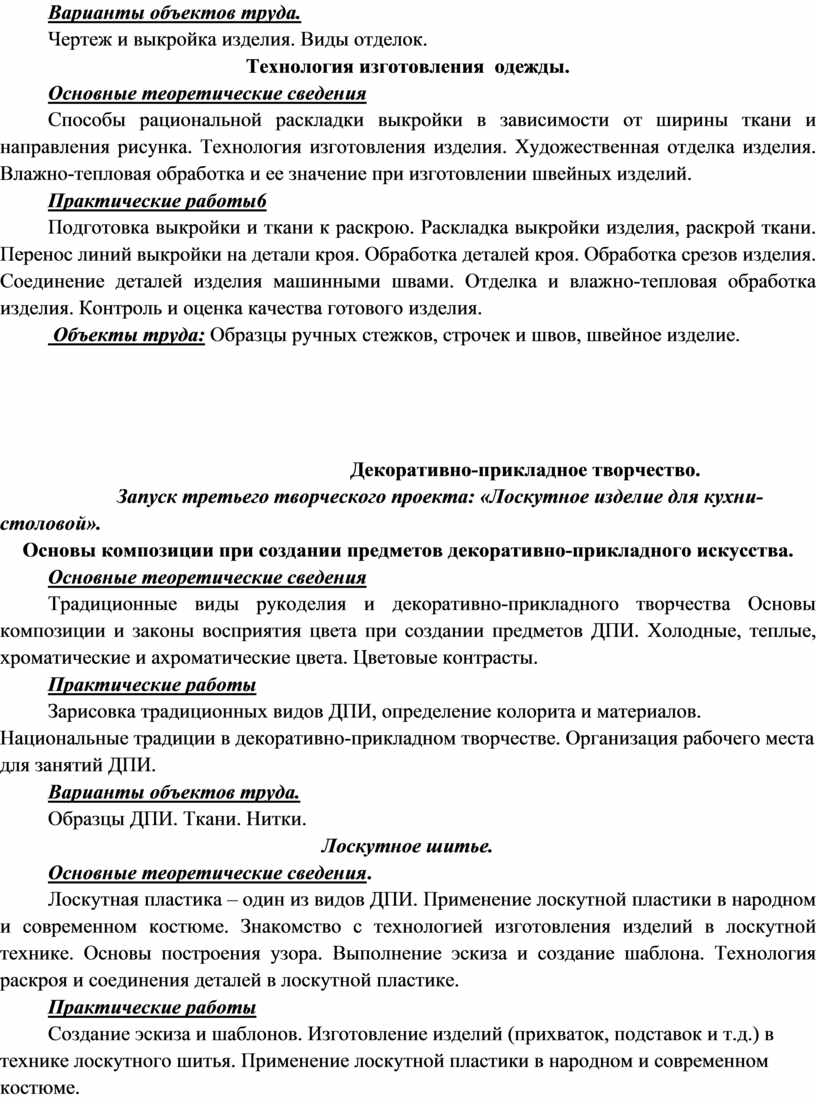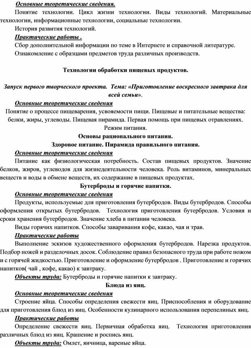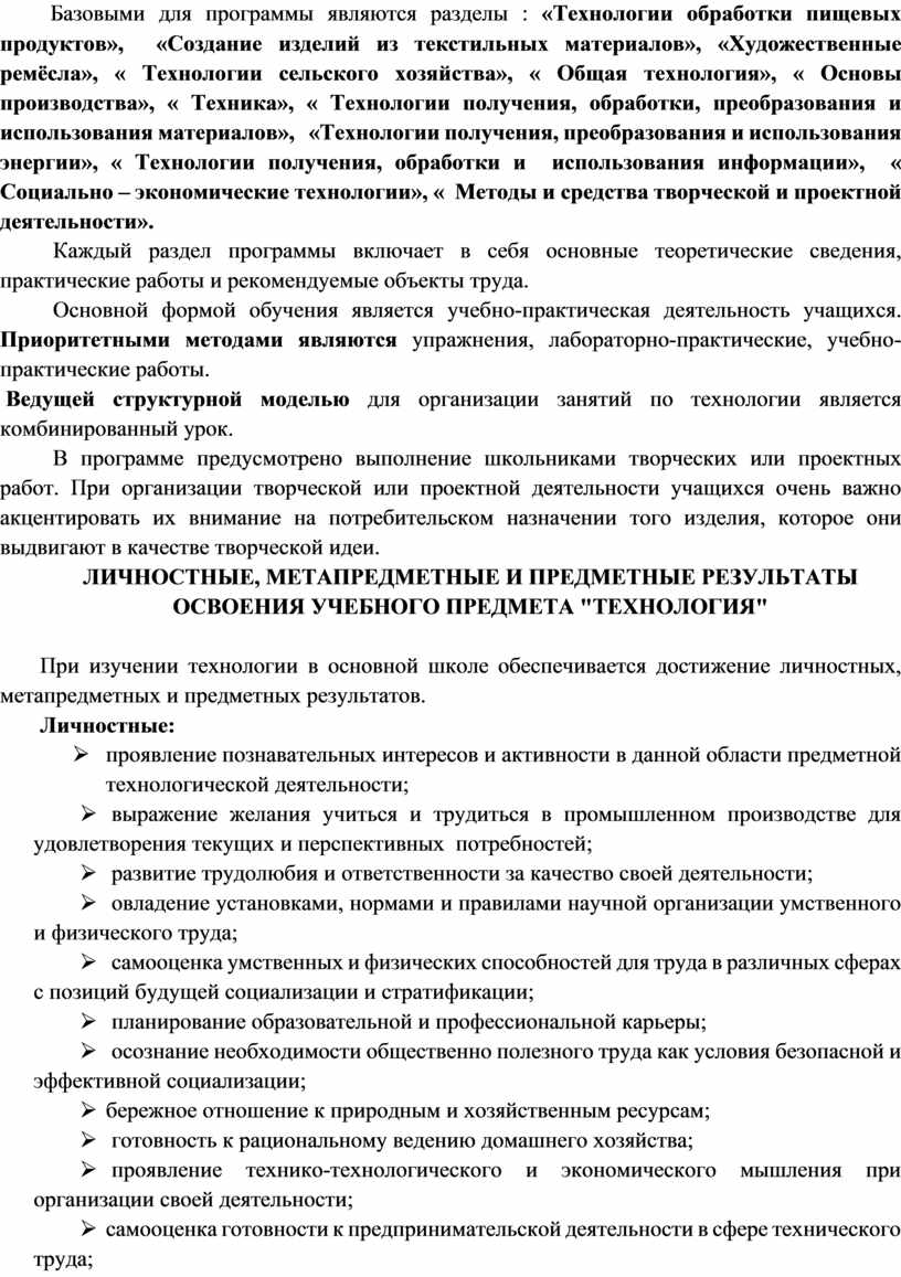 Базовыми для программы являются разделы : «Технологии обработки пищевых продуктов», «Создание изделий из текстильных материалов», «Художественные ремёсла», « Технологии сельского хозяйства», « Общая технология», « Основы производства», « Техника», « Технологии получения, обработки, преобразования и использования материалов», «Технологии получения, преобразования и использования энергии», « Технологии получения, обработки и использования информации», « Социально – экономические технологии», « Методы и средства творческой и проектной деятельности».