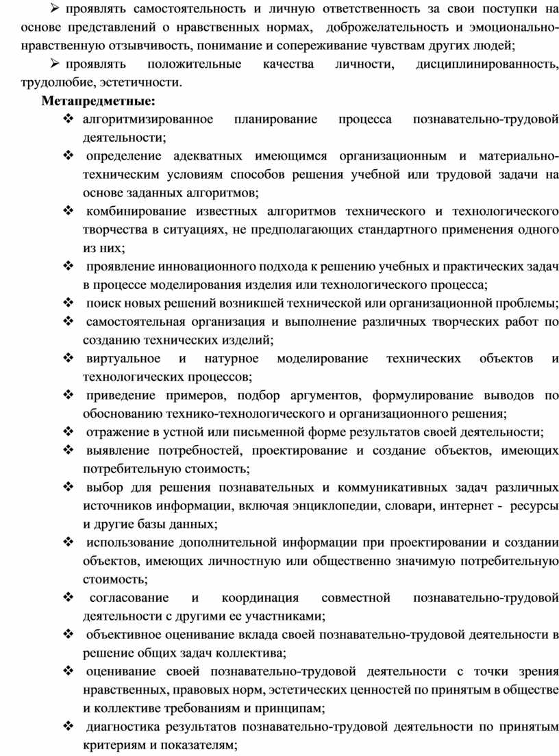 При изучении технологии в основной школе обеспечивается достижение личностных, метапредметных и предметных результатов.