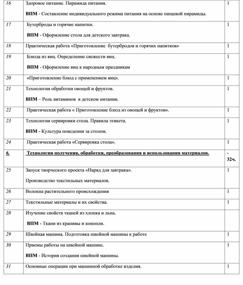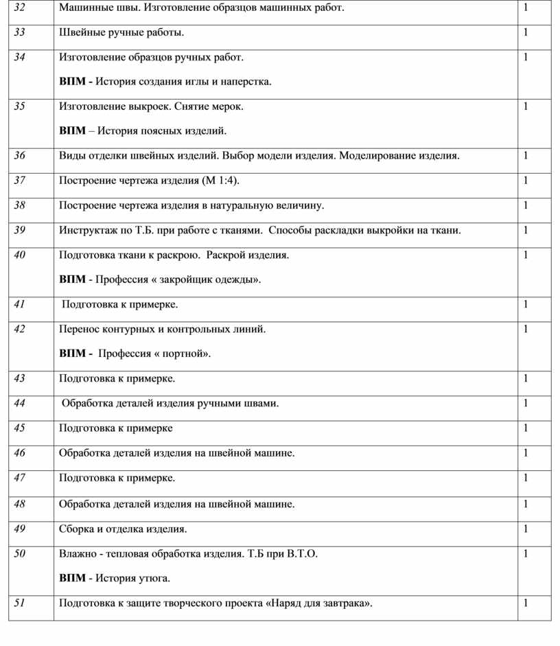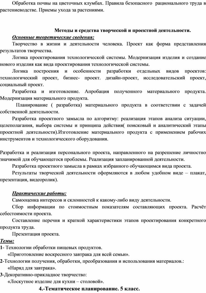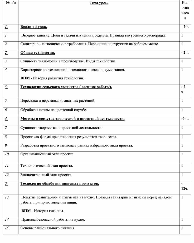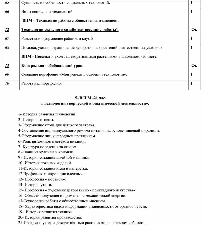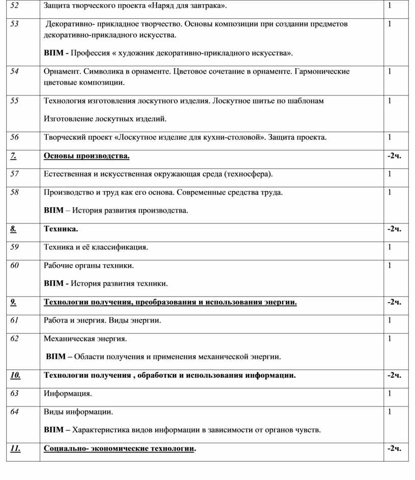 Инвариантная часть: 49 часов. - Вводное занятие - 2 часа. - Общая технология - 2 часа. -Технологии сельского хозяйства (осенние работы)- - 2 часа. - Методы и средства творческой и проектной деятельности – 2 часа. - Технология обработки пищевых продуктов -8 часов -Технология получения обработки, преобразования и использования материалов -18 часов. -Основы производства - 2 часа. - Техника - 2 часа. -Технология получения, преобразования и использования энергии - 2 часа. -Технология получения, обработки и использования информации - 2 часа. -Социальные технологии- 2 часа. -Технологии сельского хозяйства (весенние работы)- 2 часа -Животноводство-2 часа. -Контрольно-обобщающее занятие- 1 час.