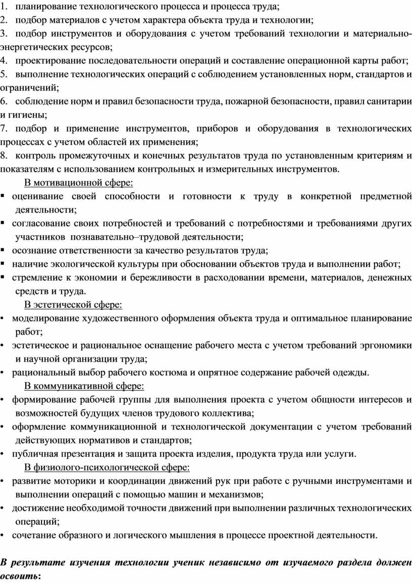 · овладение трудовыми и специальными умениями, необходимыми для поиска и использования технологической информации, проектирования и создания продуктов труда, ведения домашнего хозяйства, самостоятельного и осознанного определения своих жизненных и профессиональных планов; безопасными приемами труда;