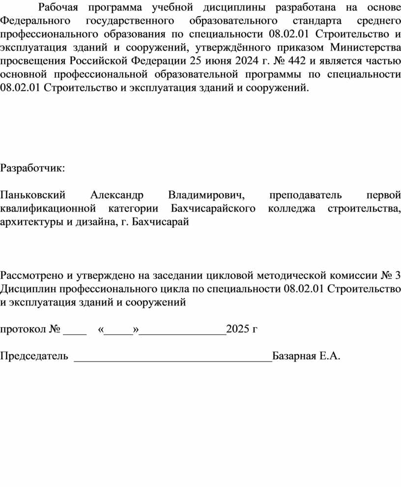 Рабочая программа учебной дисциплины разработана на основе Федерального государственного образовательного стандарта среднего профессионального образования по специальности 08.02.01 Строительство и эксплуатация зданий и сооружений, утверждённого приказом Министерства просвещения Российской Федерации 25 июня 2024 г. № 442 и является частью основной профессиональной образовательной программы по специальности 08.02.01 Строительство и эксплуатация зданий и сооружений.