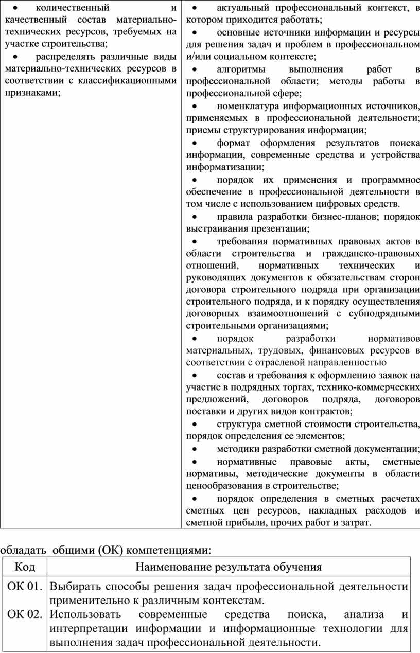 · актуальный профессиональный контекст, в котором приходится работать; · основные источники информации и ресурсы для решения задач и проблем в профессиональном и/или социальном контексте; · алгоритмы выполнения работ в профессиональной области; методы работы в профессиональной сфере; · номенклатура информационных источников, применяемых в профессиональной деятельности; приемы структурирования информации; · формат оформления результатов поиска информации, современные средства и устройства информатизации; · порядок их применения и программное обеспечение в профессиональной деятельности в том числе с использованием цифровых средств. · правила разработки бизнес-планов; порядок выстраивания презентации; · требования нормативных правовых актов в области строительства и гражданско-правовых отношений, нормативных технических и руководящих документов к обязательствам сторон договора строительного подряда при организации строительного подряда, и к порядку осуществления договорных взаимоотношений с субподрядными строительными организациями; · порядок разработки нормативов материальных, трудовых, финансовых ресурсов в соответствии с отраслевой направленностью · состав и требования к оформлению заявок на участие в подрядных торгах, технико-коммерческих предложений, договоров подряда, договоров поставки и других видов контрактов; · структура сметной стоимости строительства, порядок определения ее элементов; · методики разработки сметной документации; · нормативные правовые акты, сметные нормативы, методические документы в области ценообразования в строительстве; · порядок определения в сметных расчетах сметных цен ресурсов, накладных расходов и сметной прибыли, прочих работ и затрат. |