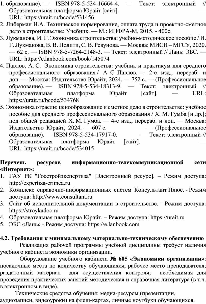 7. Павлов, А. С. Экономика строительства: учебник и практикум для среднего профессионального образования / А. С. Павлов. — 2-е изд., перераб. и доп. — Москва: Издательство Юрайт, 2024. — 752 с. — (Профессиональное образование). — ISBN 978-5-534-18313-9. — Текст: электронный // Образовательная платформа Юрайт [сайт]. — URL: https://urait.ru/bcode/534768