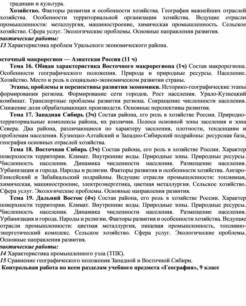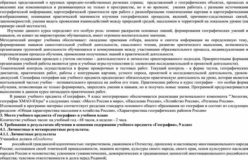 Курс «География России. Население и хозяйство», 9 класс, занимает центральное место в системе школьного географического образования. Этот курс завершает базовое географическое образование школьников. В нём обобщаются и дополняются уже имеющиеся у них физико-географические знания, совершенствуются умения; формируются новые для учащихся социально-экономические знания об объектах, процессах, явлениях, закономерностях развития населения и хозяйства страны, о методах научного исследования; формируются представления о крупных географических регионах России; развиваются метапредметные знания и умения, в том числе умение работать с разнообразными средствами обучения и дополнительными источниками географической информации. Полученные в курсе «География России. Население и хозяйство» знания и сформированные умения являются основой для успешного изучения профильных курсов географии в 10–11 классах. Особая роль курса «География России. Население и хозяйство», определяется его мировоззренческим и воспитательным значением, а также тесными связями изучаемого содержания с современностью и личным опытом учащихся. Главная цель курса «География России. Население и хозяйство» заключается в развитии у школьников географического мышления, а также таких личностных качеств, как гражданственность и патриотизм. Наряду с курсами истории и обществоведения, курс географии России - один из важнейших школьных курсов, способствующих усвоению идеалов и ценностей демократического общества, выработке активной гражданской позиции и ответственности юных граждан нашей страны.