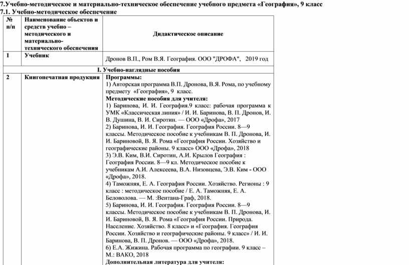 Учебно-методическое и материально-техническое обеспечение учебного предмета «География», 9 класс…….................................................................. |