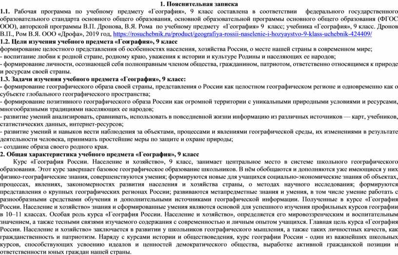 1.1. Рабочая программа по учебному предмету «География», 9 класс составлена в соответствии федерального государственного образовательного стандарта основного общего образования, основной образовательной программы основного общего образования (ФГОС ООО), авторской программы В.П. Дронова, В.Я. Рома по учебному предмету «География» 9 класс; учебника «География», 9 класс. Дронов В.П., Ром В.Я. ООО «Дрофа», 2019 год, https://rosuchebnik.ru/product/geografiya-rossii-naselenie-i-hozyaystvo-9-klass-uchebnik-424409/