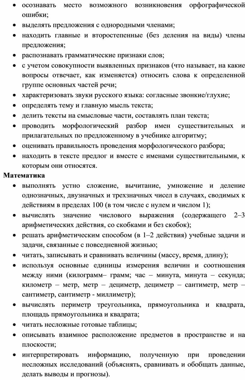 · Использование начальных математических знаний для описания и объяснения окружающих предметов, процессов, явлений, для оценки количественных и пространственных отношений предметов, процессов, явлений. Читать, записывать и сравнивать величины (массу, время, длину, площадь, скорость), используя основные единицы измерения величин и соотношения между ними (килограмм – грамм; час – минута, минута – секунда; километр – метр, метр – дециметр, дециметр – сантиметр, метр – сантиметр);