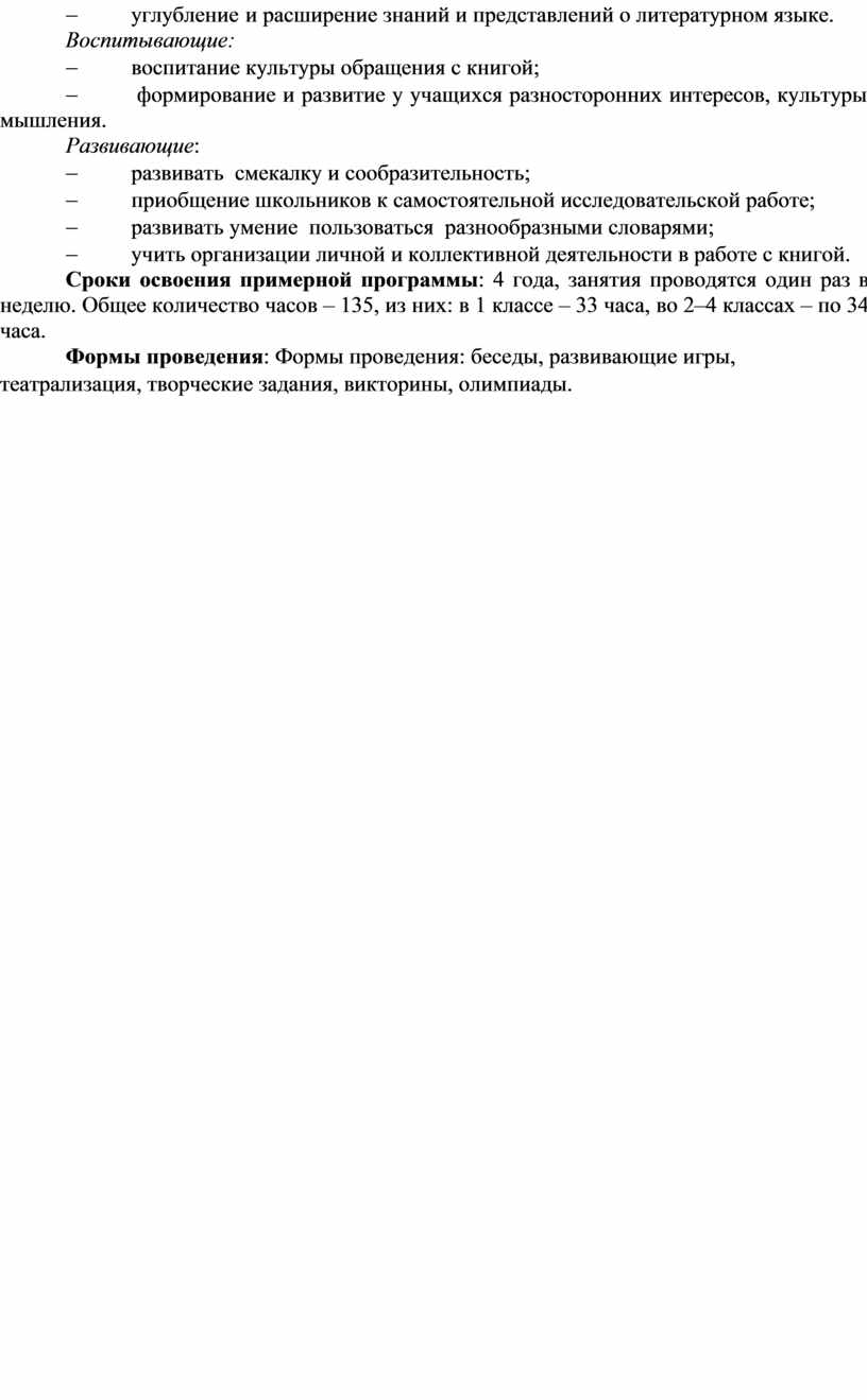 Сроки освоения примерной программы: 4 года, занятия проводятся один раз в неделю. Общее количество часов – 135, из них: в 1 классе – 33 часа, во 2–4 классах – по 34 часа.