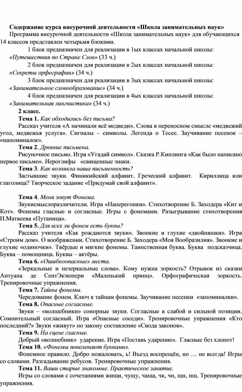 Программа внеурочной деятельности «Школа занимательных наук» для обучающихся 14 классов представлен четырьмя блоками.