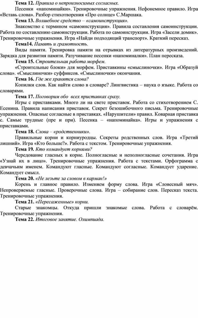 Корень и главное правило. Изменяем форму слова. Игра «Словесный мяч». Непроверяемые гласные. Проверочные слова. Игра – собирание слов. Пересказ текста. Тренировочные упражнения.