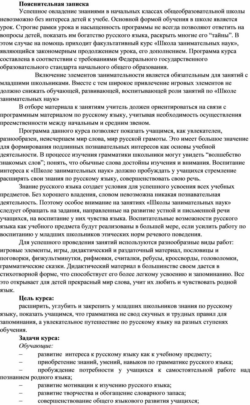 Успешное овладение знаниями в начальных классах общеобразовательной школы невозможно без интереса детей к учебе. Основной формой обучения в школе является урок. Строгие рамки урока и насыщенность программы не всегда позволяют ответить на вопросы детей, показать им богатство русского языка, раскрыть многие его “тайны”. В этом случае на помощь приходит факультативный курс «Школа занимательных наук», являющийся закономерным продолжением урока, его дополнением. Программа курса составлена в соответствии с требованиями Федерального государственного образовательного стандарта начального общего образования.