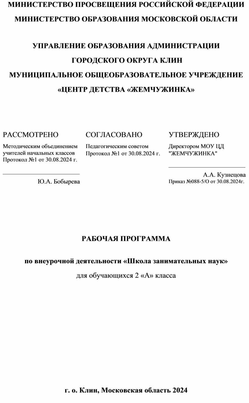УТВЕРЖДЕНО Директором МОУ ЦД "ЖЕМЧУЖИНКА" ________________________ А.А. Кузнецова Приказ №088-5/О от 30.08.2024г.