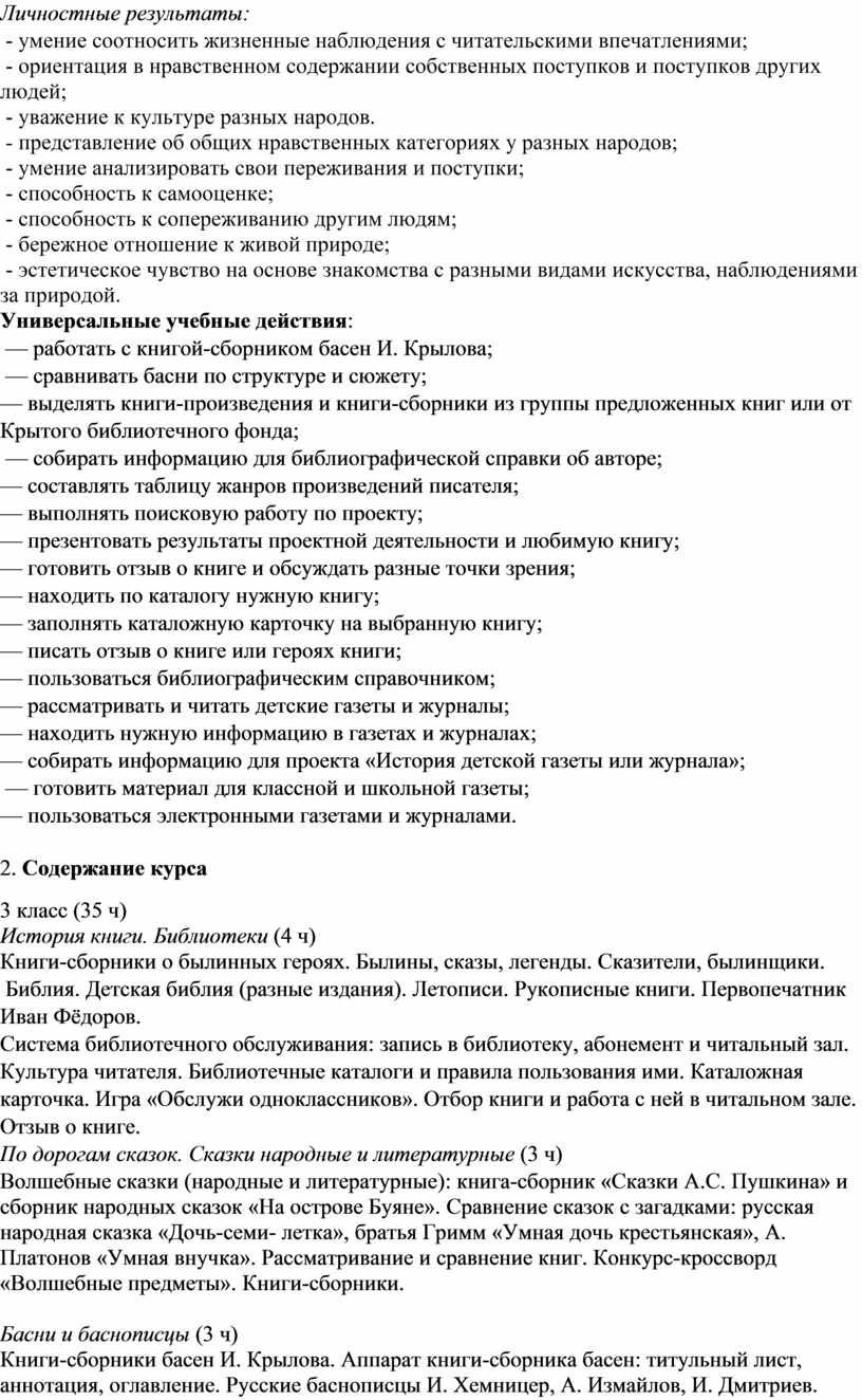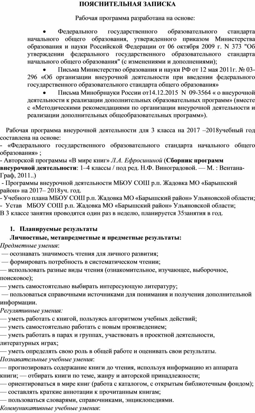 - Авторской программы «В мире книг» Л.А. Ефросининой (Сборник программ внеурочной деятельности: 1–4 классы / под ред. Н.Ф. Виноградовой. — М. : Вентана- Граф, 2011..)