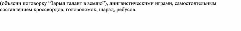 · самостоятельная работа (индивидуальная и групповая.) Интерес учащихся поддерживается удачно подобранными текстами (например, “Притча о талантах), внесением творческого элемента в занятия (объясни поговорку “Зарыл талант в землю”), лингвистическими играми, самостоятельным составлением кроссвордов, головоломок, шарад, ребусов.