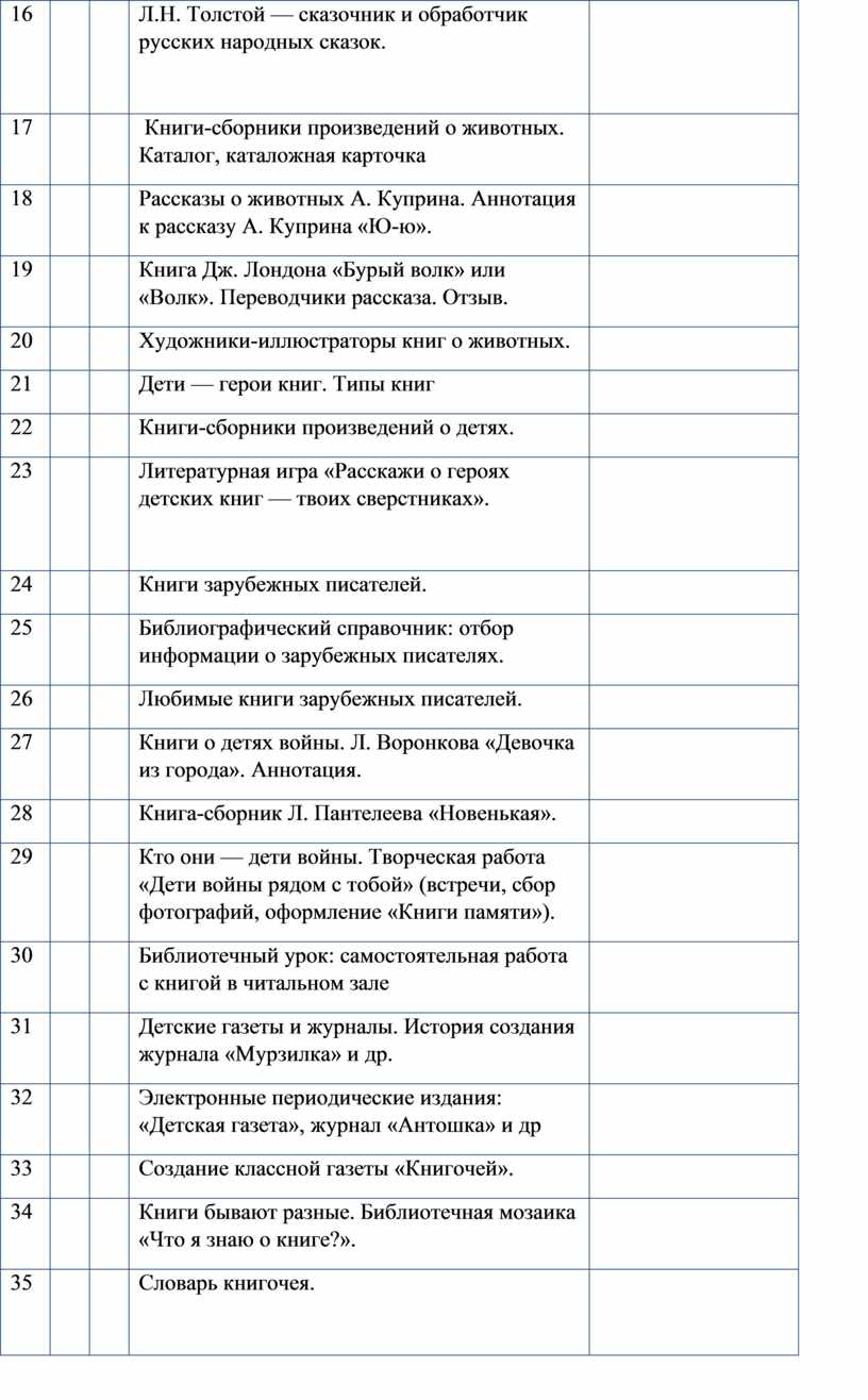 Книги Л.Н. Толстого: работа с каталогом, составление выставки книг. Книга «Азбука Л.Н. Толстого» и сборник «Для детей». Составление таблицы жанров произведений Л.Н. Толстого (работа в группах). Проектная деятельность по группам: «Сказки Л.Н. Толстого», «Сказки в обработке Л.Н. Толстого».