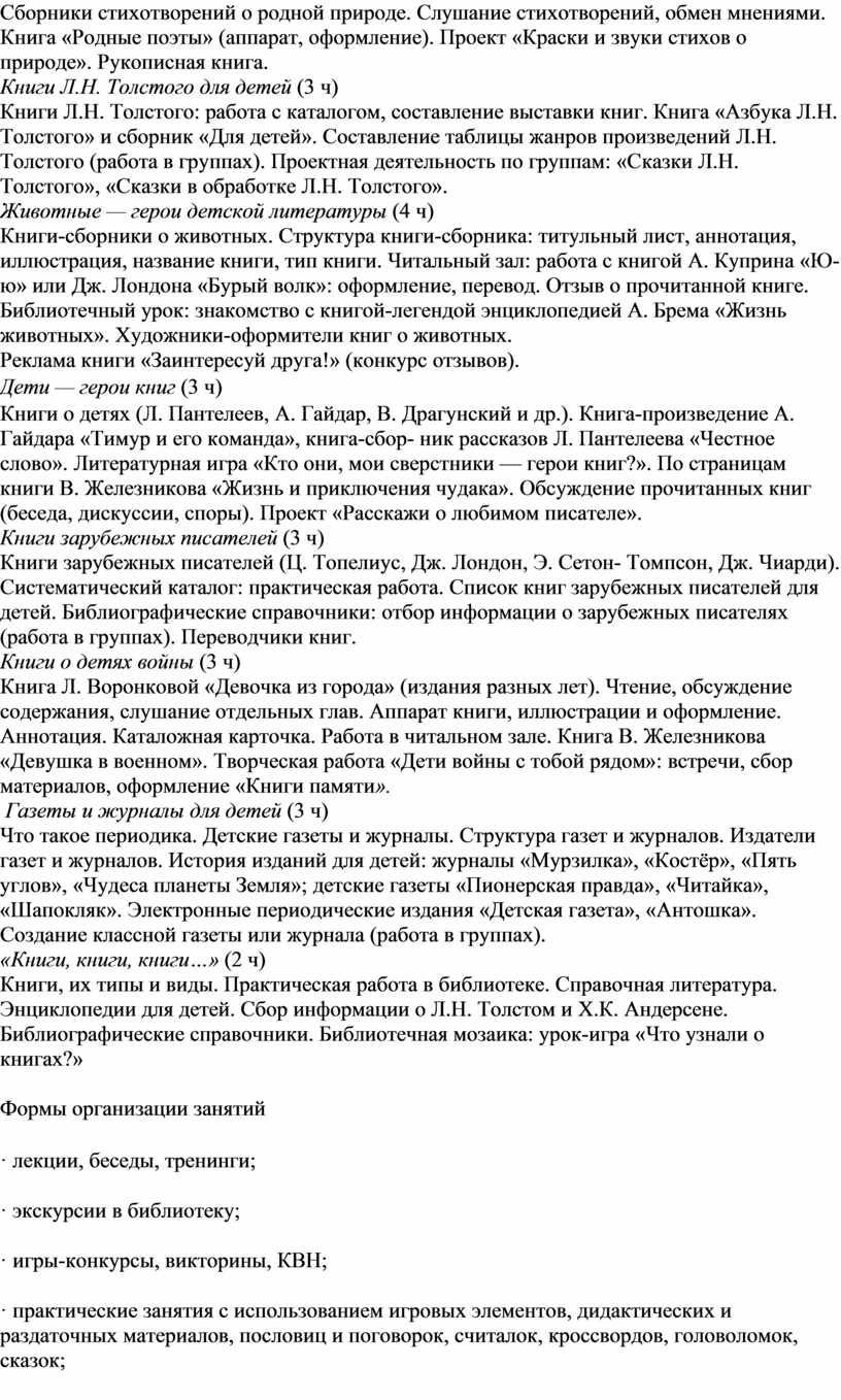 Книги-сборники о животных. Структура книги-сборника: титульный лист, аннотация, иллюстрация, название книги, тип книги. Читальный зал: работа с книгой А. Куприна «Ю-ю» или Дж. Лондона «Бурый волк»: оформление, перевод. Отзыв о прочитанной книге. Библиотечный урок: знакомство с книгой-легендой энциклопедией А. Брема «Жизнь животных». Художники-оформители книг о животных.