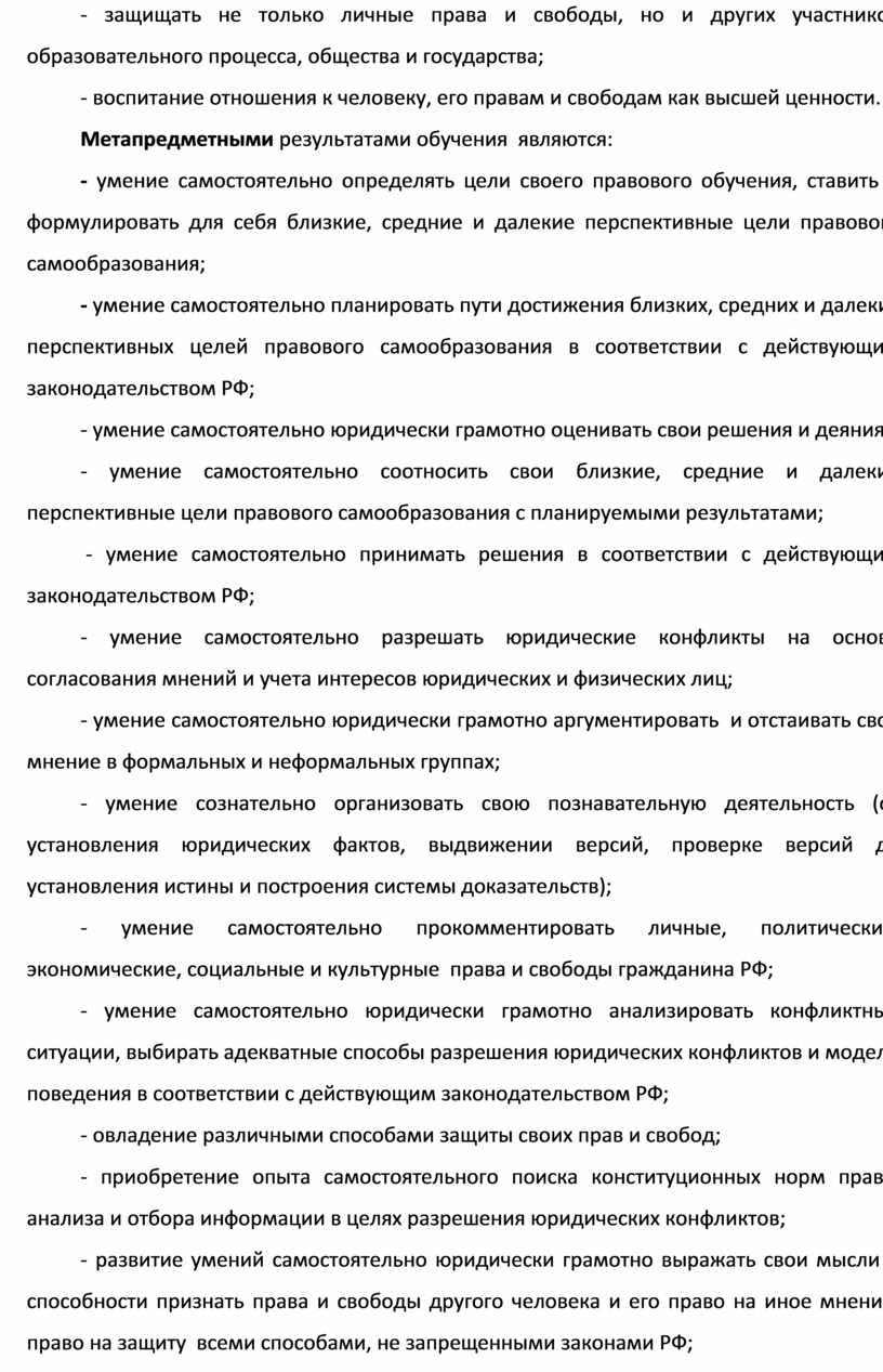 - развитие умений самостоятельно юридически грамотно выражать свои мысли и способности признать права и свободы другого человека и его право на иное мнение, право на защиту всеми способами, не запрещенными законами РФ;