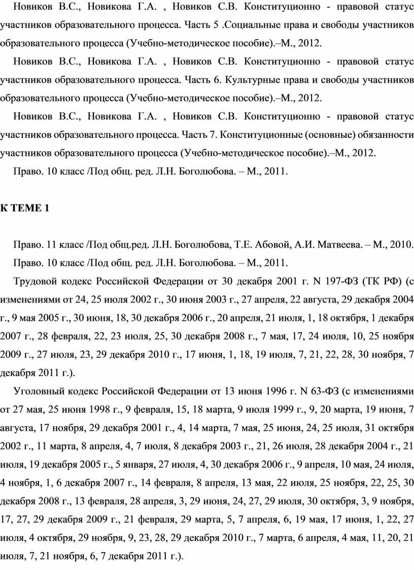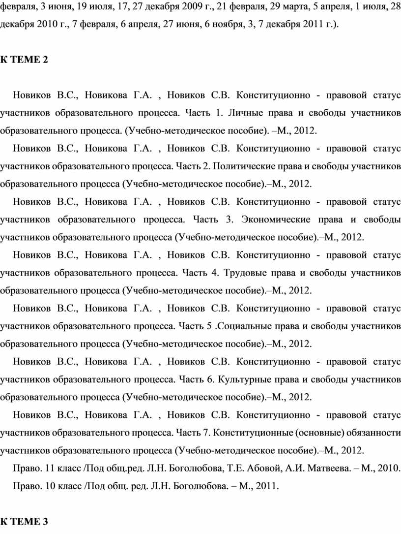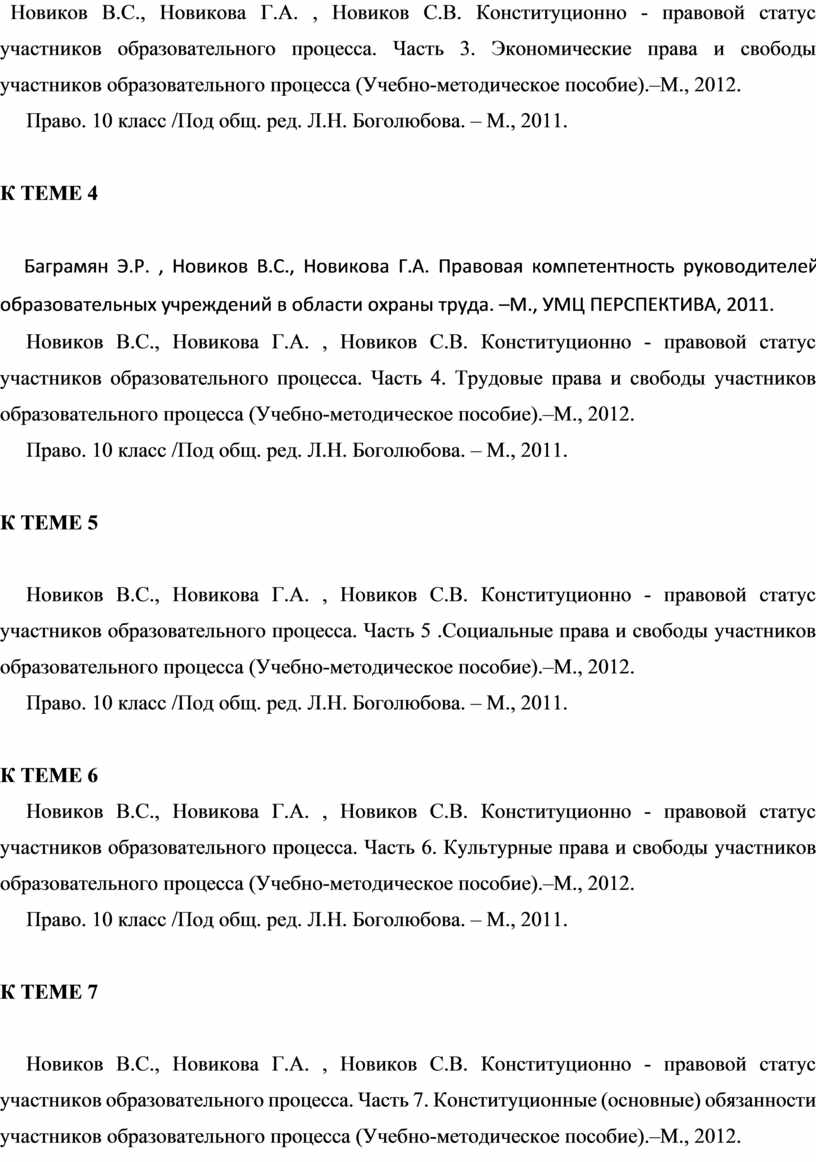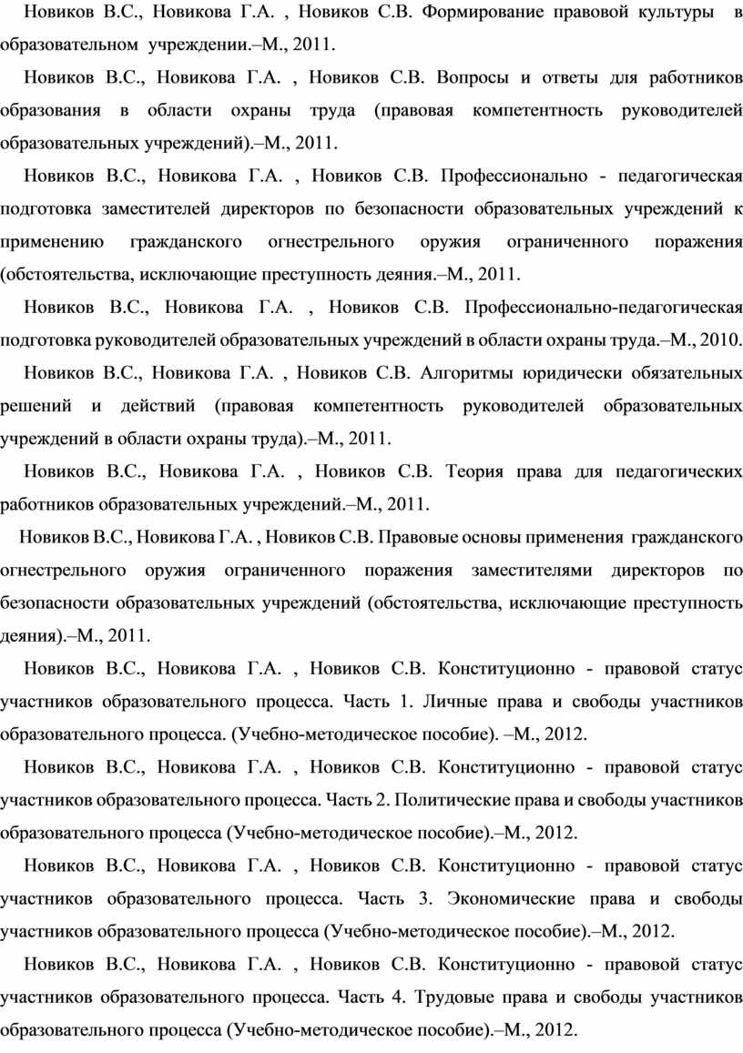 Новиков В.С., Новикова Г.А. , Новиков С.В. Конституционно - правовой статус участников образовательного процесса. Часть 1. Личные права и свободы участников образовательного процесса. (Учебно-методическое пособие). –М., 2012.