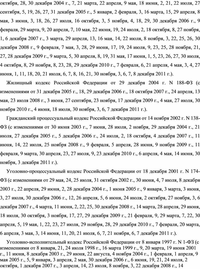 Жилищный кодекс Российской Федерации от 29 декабря 2004 г. N 188-ФЗ (с изменениями от 31 декабря 2005 г., 18, 29 декабря 2006 г., 18 октября 2007 г., 24 апреля, 13 мая, 23 июля 2008 г., 3 июня, 27 сентября, 23 ноября, 17 декабря 2009 г., 4 мая, 27 июля, 30 ноября 2010 г., 4 июня, 18 июля, 30 ноября, 3, 6, 7 декабря 2011 г.).